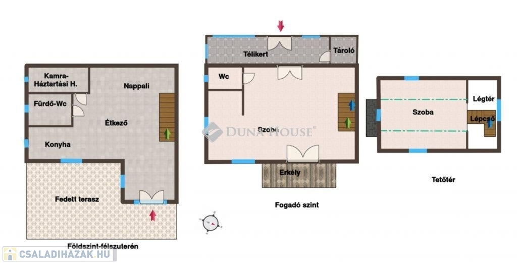 A lakóház a telek közepén kapott helyet, melynek földszinti része 40 m2+20 m2 fedett terasz. A félemeleten 1 szoba, télikerttel, panorámás terasszal, mellékhelyiséggel került kialakításra 48 m2-en.