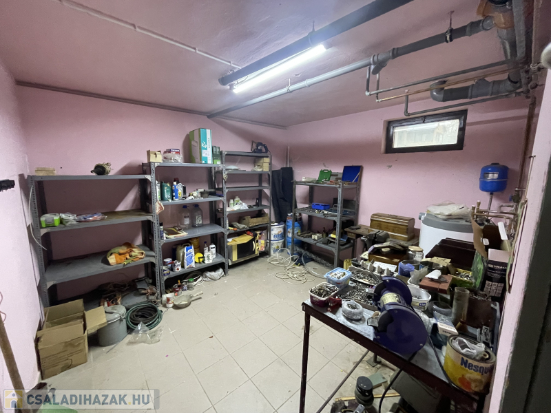 A ház alápincézett, több helyiségre osztott, melyek ablakosak, így a pince természetes fényt is kap. Itt került elhelyezésre a két autó kényelmes tárolására alkalmas nagy méretű garázs, a gázcirkó, egy WC kézmosóval, több tárolóhelyiség. A pince a lakótérből, a garázson keresztül és a kert felőli lejáraton is megközelíthető. Az udvaron is van lehetőség autóval parkolni, valamint a ház előtti térkövezett területen is.