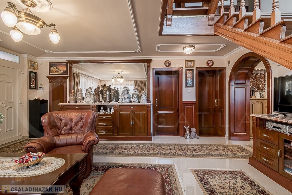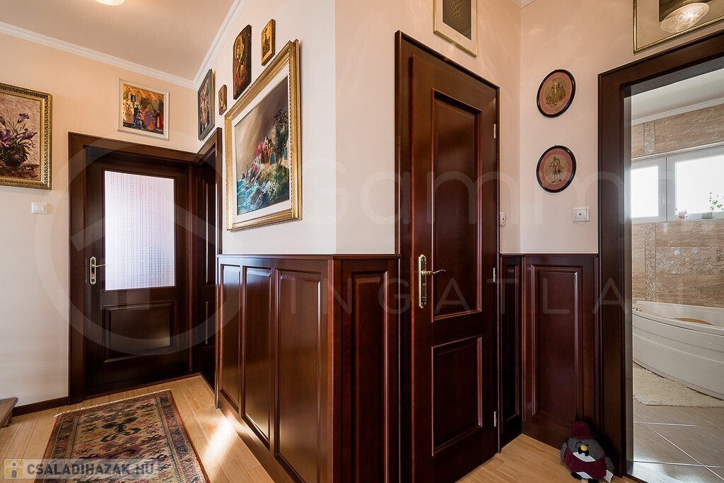 - A belső tereket minőségi, egyedi tervezésű fa ajtók és a hozzájuk illő falburkolatok teszik otthonossá és elegánssá.