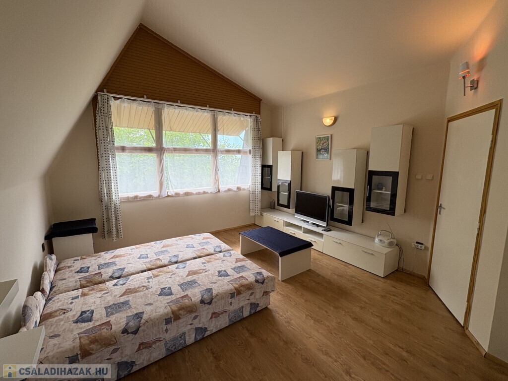 Fonyód egyik legértékesebb utcájában - a Bartók Béla utcában - 3 önálló lakásból álló, összesen 234 m2-es családi ház eladó. A földszinten előszoba-nappali-étkező-konyha, 2 szoba, közlekedő, gardrób, fürdőszoba, wc-kézmosó helyiségek találhatóak, valamint tartozik hozzá egy tároló-műhely is. A középső szinten található lakásba egy nagy teraszról lehet bejutni, itt előszoba-étkező-konyha, nappali, 2 szoba, fürdőszoba-wc és egy tároló helyiség került kialakításra. A lakóház tetőterében kialakított lakásba a feljárat a középső nagy teraszról teraszról nyílik, ebben a lakásban nappali, konyha-étkező-zuhanyzó-wc, valamint 1 szoba van. A lakások fűtése gázkazánnal megoldott, illetve a földszinti lakrészben egy kályha, míg a középső szinten található lakásban kandalló biztosítja kiegészítő fűtésként a meleget. Az ingatlan szezonban könnyen kiadható, az egyik különlegessége, hogy a középső szintről és a tetőtérből szép kilátás nyílik a Balatonra. Telek: 728 m2