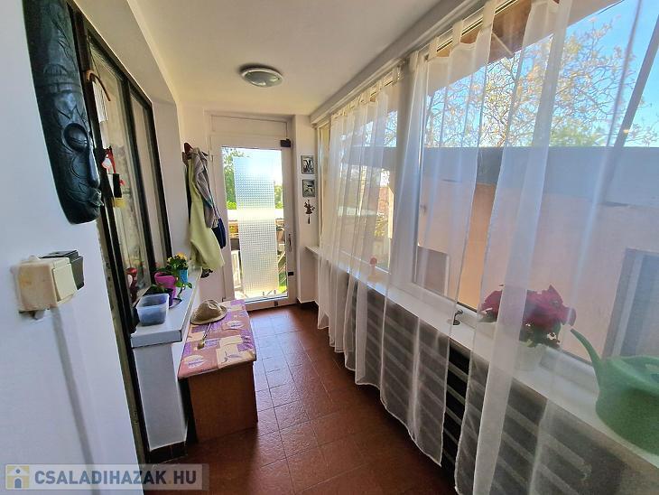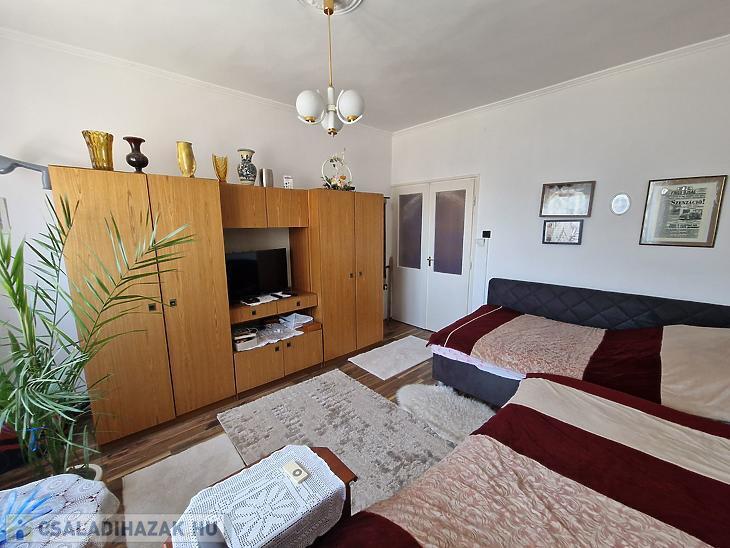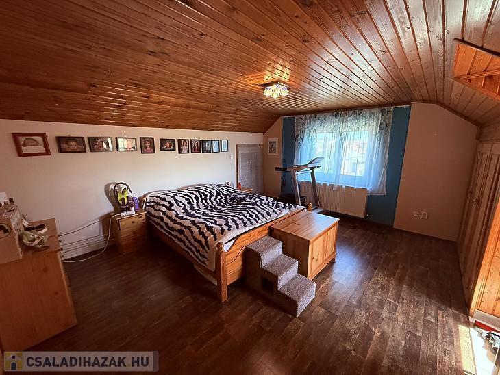 A felső lakás kb. 105 nm, tágas nappalival, 2 hálószobával beépített szekrényekkel, külön gardróbbal, konyha-étkezővel és kádas-zuhanyzós fürdővel. Műanyag, dupla üvegezésű nyílászárók szúnyoghálóval, részben elektromos redőnyökkel, 2 klíma (ebből egy 3,5 kW-os), a fűtést Ariston kondenzációs kazán biztosítja.