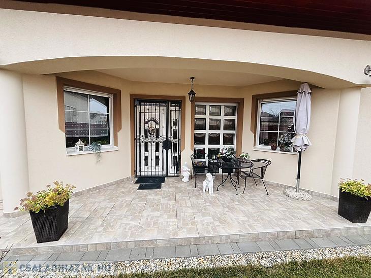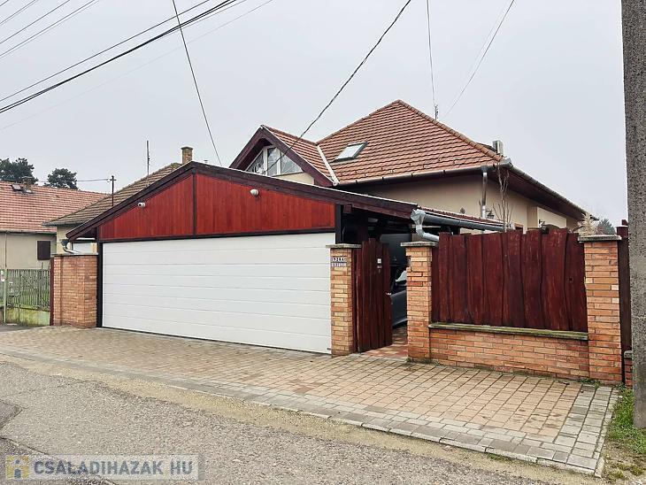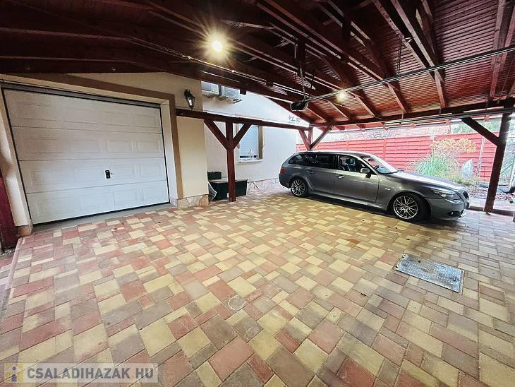 A parkolás teljes mértékben megoldott: az 50 m²-es, fedett viacolor beállón akár három autó is kényelmesen elfér, a garázs elektromos, 8 méter széles szekcionált kapuval felszerelt, a ház előtt pedig további két parkolóhely áll rendelkezésre. A napelem és hőszivattyú kiépítése előkészítve, a H-tarifa igénylése folyamatban, a puffertartály már beépítésre került.