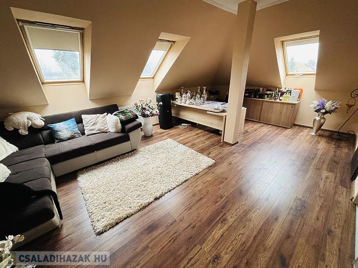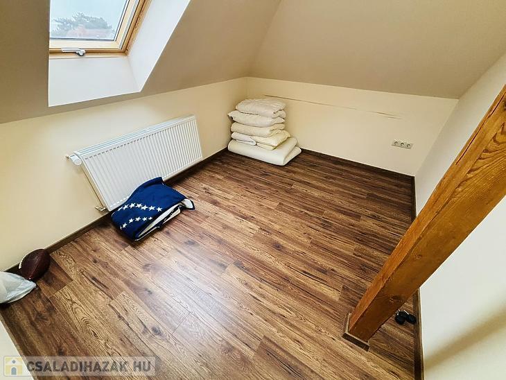 Az emeleten egy impozáns nappali várja az új tulajdonost – szükség esetén konyha kialakítására is adott a lehetőség –, emellett négy hálószoba, egy újabb fürdő, WC és egy praktikus gardróbhelyiség biztosítja a komfortot.