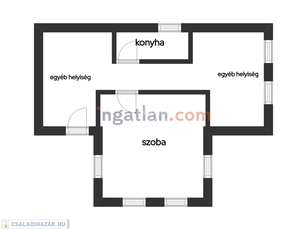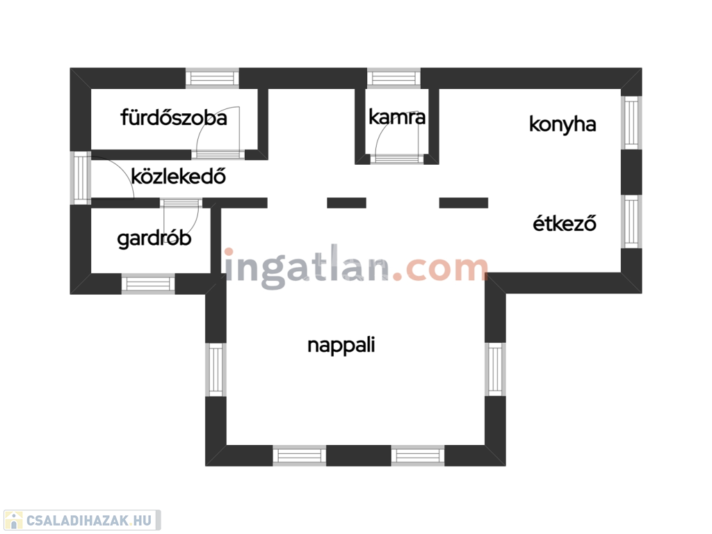 Földszint: folyosó, fürdőszoba zuhanyzó, wc, gardrob szoba, nappali, konyha, étkező és egy tároló.
