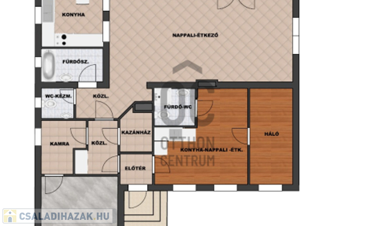 A nagyobb lakórész nem csak a főbejáraton, hanem a garázsból is közvetlen bejárható. Kamrából a közlekedőbe és már a nappali étkezőben is vagyunk. Itt elszeparálva de egy légtérben van együtt a konyhával. Tágas ajtók nyílnak a fedett erkélyre és két különálló hálószobára. Egy fürdőszoba, egy külön WC, egy kazánház, modern infra szauna nyílik a közlekedőből.
