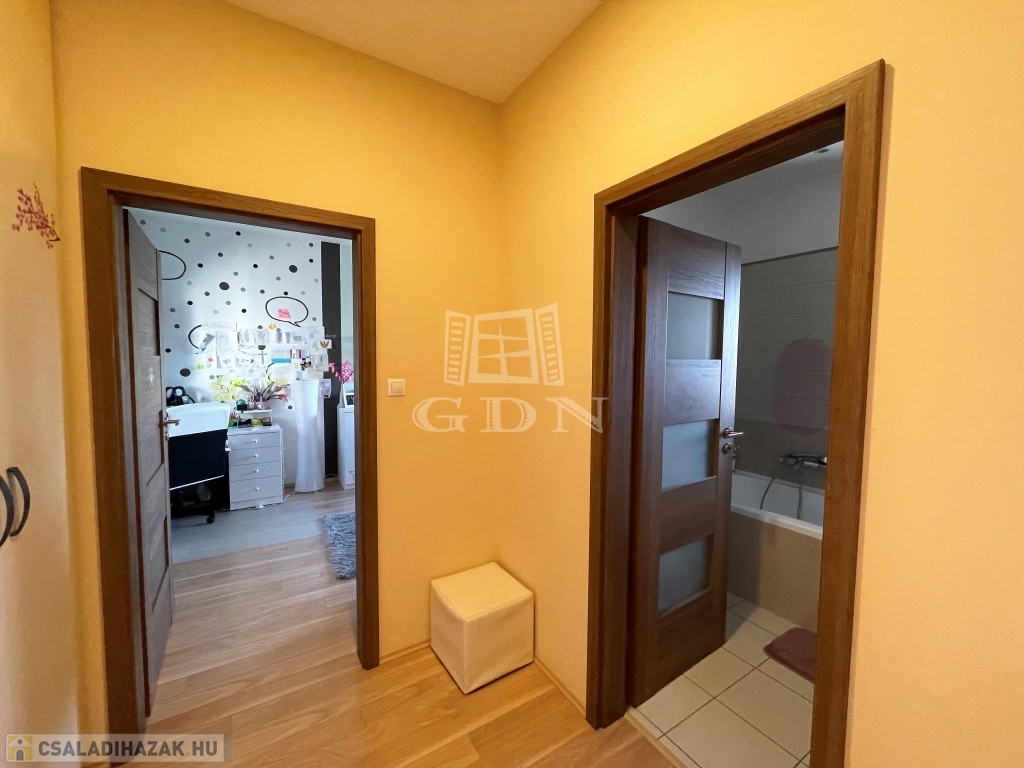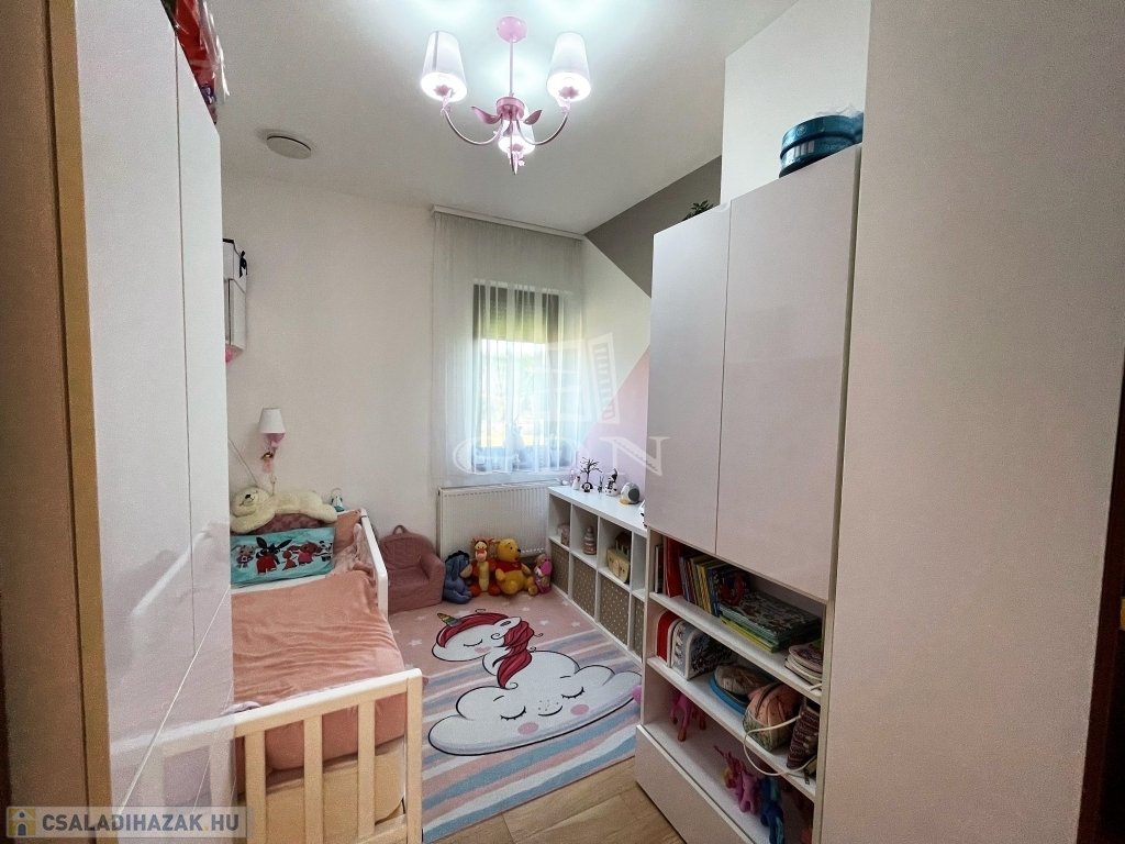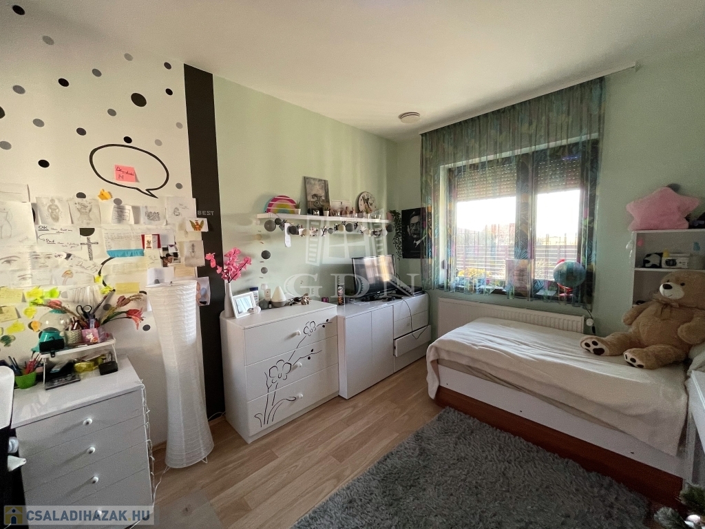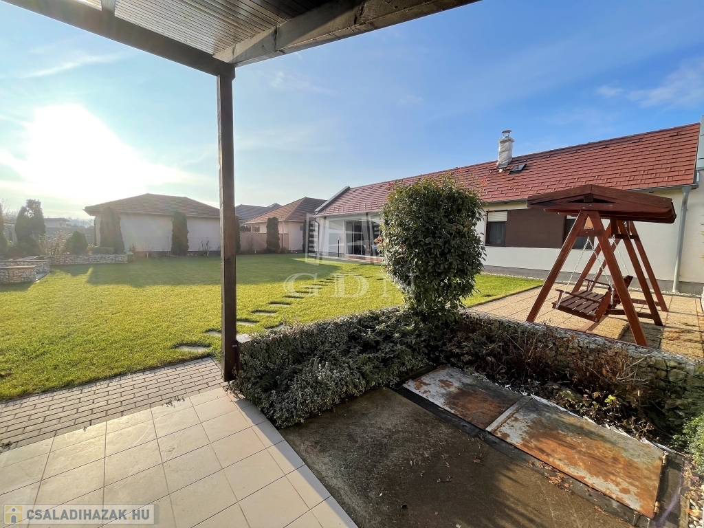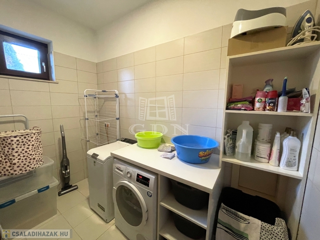 A kertben található még egy 20nm-es kis ház (2cm-es szigeteléssel) járolapozva a kerti eszközök tárolására illetve műhely lehetőséggel. Továbbá egy hintaágy+gyerek hinta illetve egy fedett, körbe zárt 10nm-es fatározó. A kert minden pontján biztosított az áramelérés, 5 helyen van vízcsap (ebből 2 DRV). A füves rész kivételével mindenhova került geotextília. Kb 100m2 a térkövezett felület ami az aszfaltútig kiér mind két kapunál.