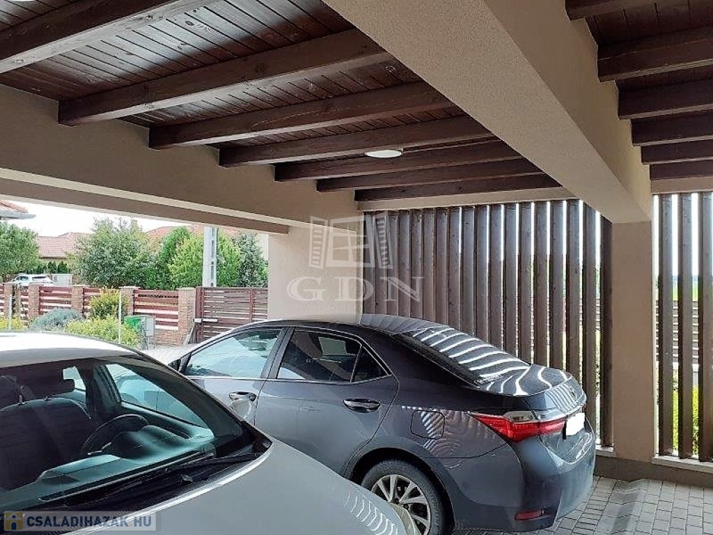 A két autó parkolására alkalmas fedett 38 nm-es gépkocsibeálló, egy egységet képez a házzal.