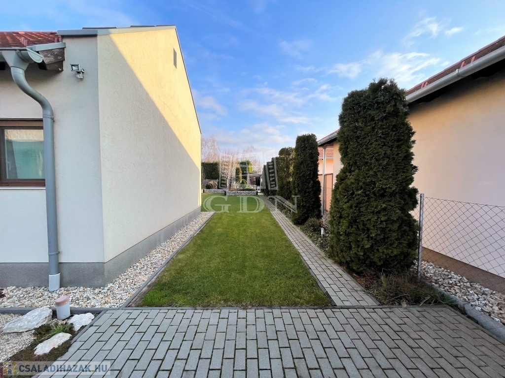 A parkosított, összközműves telek 1265 nm, ahol helyet kapott egy 20nm-es tároló és egy 10 nm-es fatároló.