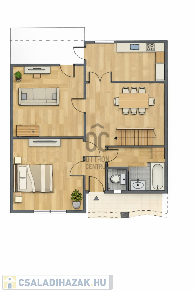 • földszinten: nappali, konyha, étkező, hálószoba, fürdő, külön WC, nagy terasz