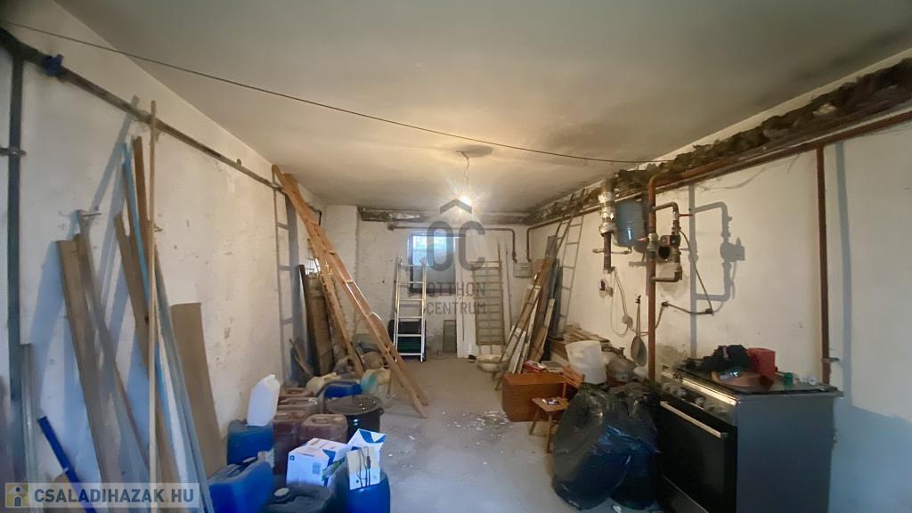 A lakótérből is megközelíthető alagsor kb. 60 m²-es, ahol több tárolóhelyiség és garázs kapott helyet — ideális megoldás akár barkácsoláshoz vagy tároláshoz.