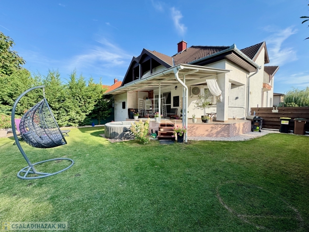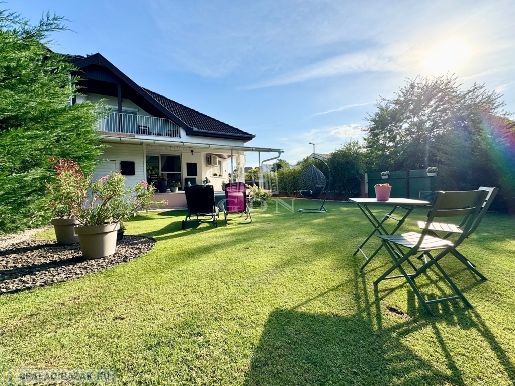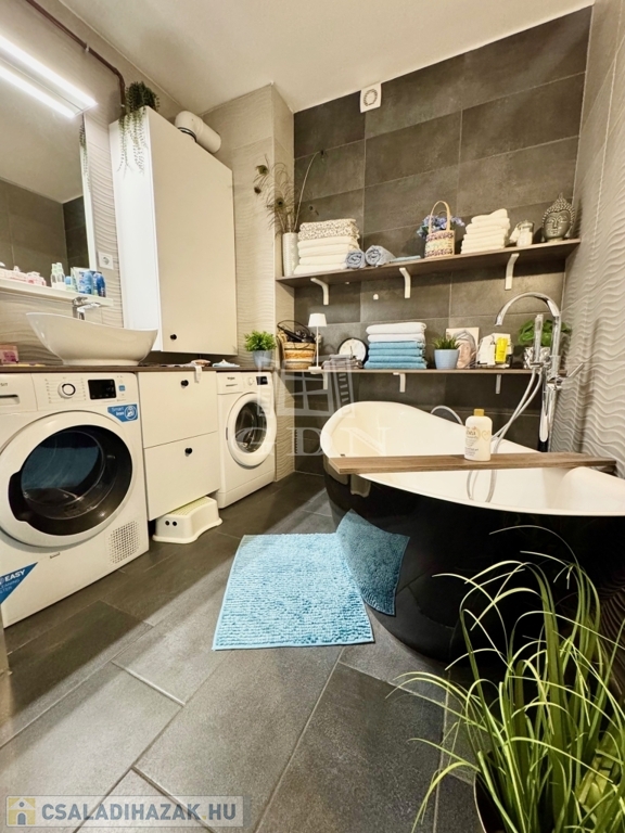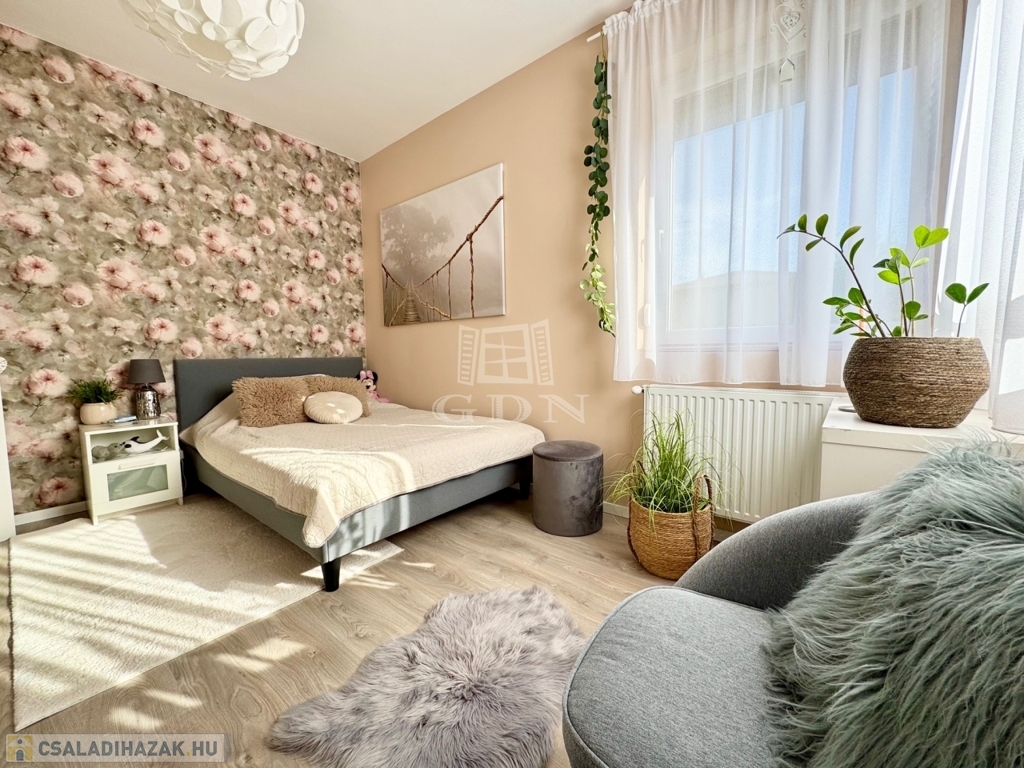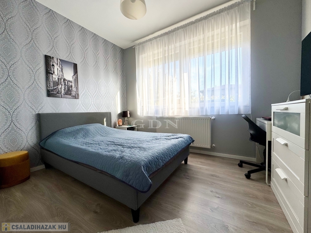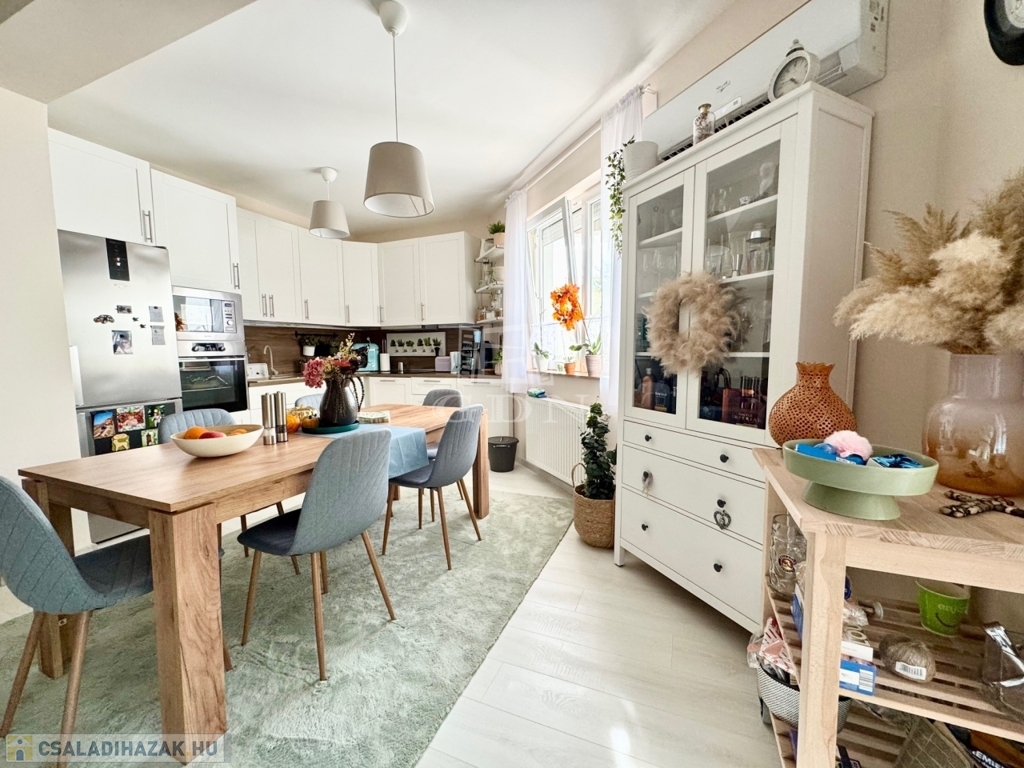 Göd kedvelt városrészén, Oázis lakóparkban, kertvárosi környezetben, csendes aszfaltozott mellékutcában, 2009-ben magas műszaki színvonalon épült, 99 nm-es lakóterületű, nappali + 2 háló + gardrób szobás, (könnyedén minimális költséggel nappali+3 hálóssá alakítható!!), amerikai konyhás, közvetlen kert-teraszkapcsolatos, (kert 210nm + terasz 16 nm) kiváló elosztású, külön nyíló szobás, napos-világos fekvésű, alacsony fenntartású, modern, kondenzációs gázkazán fűtésű, újszerű állapotú, ikerház jellegű, klimatizált, riasztórendszerrel felszerelt lakás, beépített, gépesített konyhával, felszíni gépkocsi beállóval, 8 nm-es fűtött tárolóval, saját, közvetlenül a lakás nappaliából megközelíthető 210 nm-es, gyönyörűen karbantartott, öntözőrendszerrel kiépített kerttel, fúrt kúttal eladó.