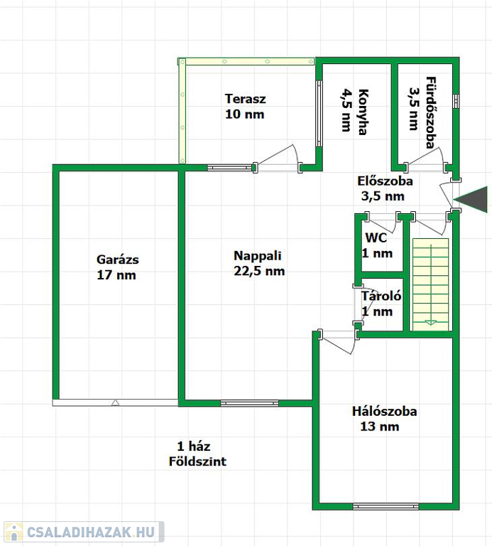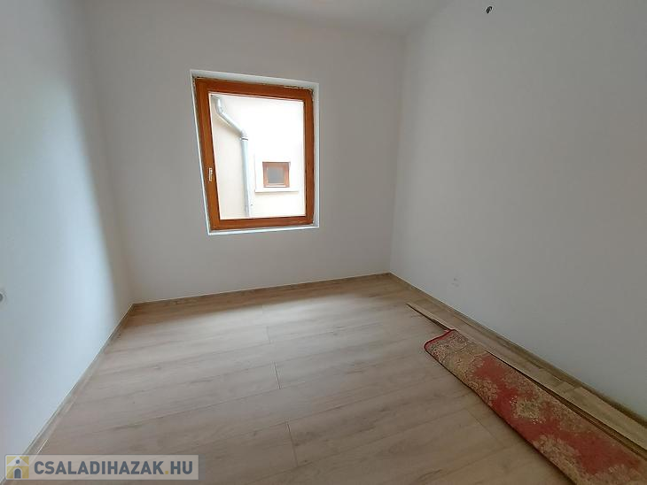 Az első ház 90 nm, 2007-ben épült, 38-as Leier téglából, belső kétszintes kialakítással. A földszinten nappali, konyha, hálószoba, kamra és egy hangulatos terasz található. A tetőtér jelenleg nincs teljesen befejezve, azonban minden gépészeti előkészítés megvan (fűtés, víz) a nyílászárók be vannak építve – így könnyedén kialakítható benne további két hálószoba és egy fürdőszoba.