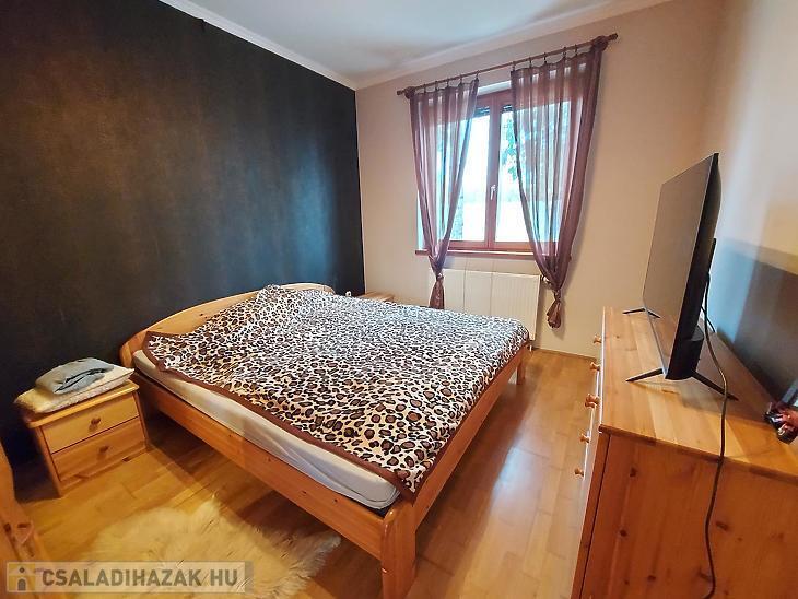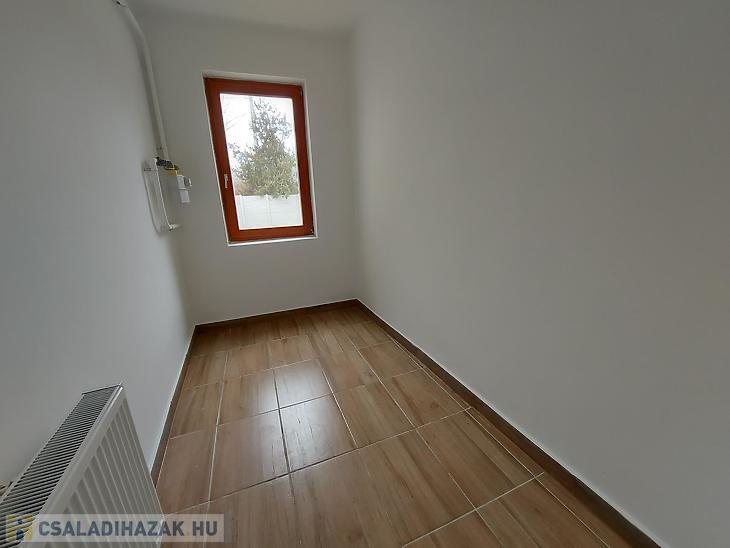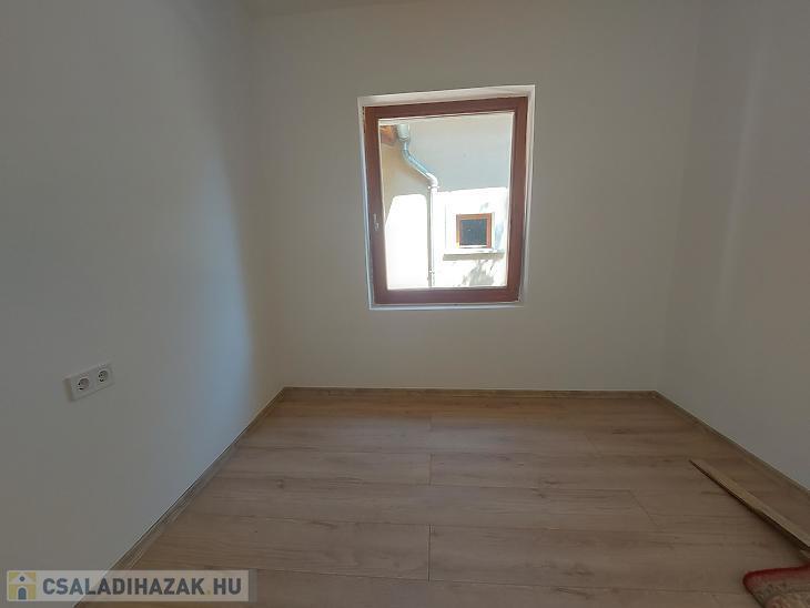 Az első ház 90 nm, 2007-ben épült, 38-as Leier téglából, belső kétszintes kialakítással. A földszinten nappali, konyha, hálószoba, kamra és egy hangulatos terasz található. A tetőtér jelenleg nincs teljesen befejezve, azonban minden gépészeti előkészítés megvan (fűtés, víz) a nyílászárók be vannak építve – így könnyedén kialakítható benne további két hálószoba és egy fürdőszoba.