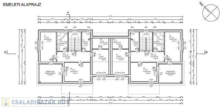 Emelet: 3 db Hálószoba, fürdőszoba, gépészeti helyiség és egy fedett terasz.