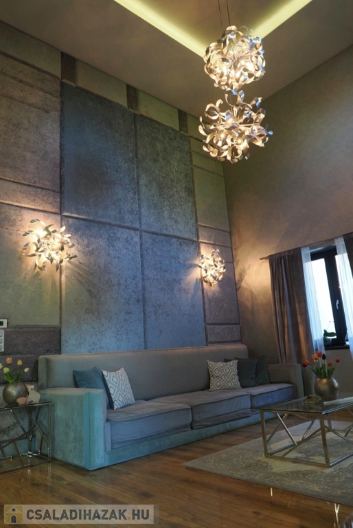 A ház fő éke a földszint izgalmas nappali-társalgó helysége, mely impozáns 6 métert meghaladó belmagasságával, kárpitozott falpanellel borított falával, a tökéletes komforthoz gyártott egyedi design bútoraival, és palakővel burkolt kandallójával magas fokon ad teret minden összejövetelnek.