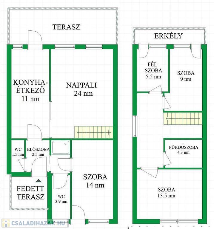 A földszinten tágas nappali, konyha, étkező, hálószoba, fürdő és külön WC kapott helyet.