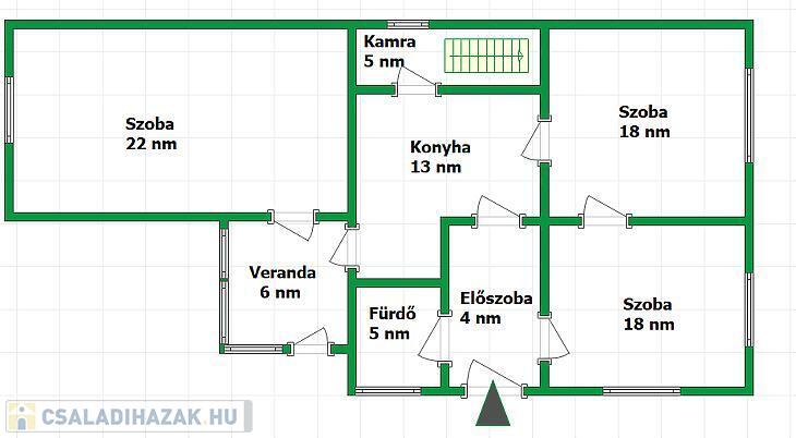 Elrendezése: 3 szoba, konyha, fürdőszoba, előszoba, veranda, valamint egy kamra.