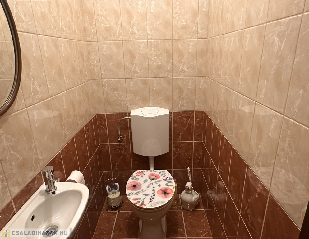 A bejárat egy 9,2m² teraszról nyílik,2 db melléképület található az ingatlan két oldalán,melyek közül a kisebbikben kézmosó és WC került kiépítésre. A nagyobb melléképület inkább tárolóként funkcionál. A ház déli -keleti és nyugati oldalakról nagy méretű redőnyös szúnyoghálós Aereco szellőztető rendszeres ablakokkal biztosítja a kellemes világos tereket. Riasztó berendezés, kaputelefon, szellőztető és öntöző rendszer teszik még komfortosabbá. Az ingatlan két oldalán könnyen karbantartható gondozott parkosított kert található,a környék csendes barátságos,a főváros 15 perc alatt elérhető kényelmesen.