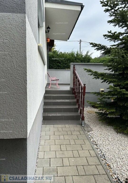 A bejárat egy 9,2m² teraszról nyílik,2 db melléképület található az ingatlan két oldalán,melyek közül a kisebbikben kézmosó és WC került kiépítésre. A nagyobb melléképület inkább tárolóként funkcionál. A ház déli -keleti és nyugati oldalakról nagy méretű redőnyös szúnyoghálós Aereco szellőztető rendszeres ablakokkal biztosítja a kellemes világos tereket. Riasztó berendezés, kaputelefon, szellőztető és öntöző rendszer teszik még komfortosabbá. Az ingatlan két oldalán könnyen karbantartható gondozott parkosított kert található,a környék csendes barátságos,a főváros 15 perc alatt elérhető kényelmesen.
