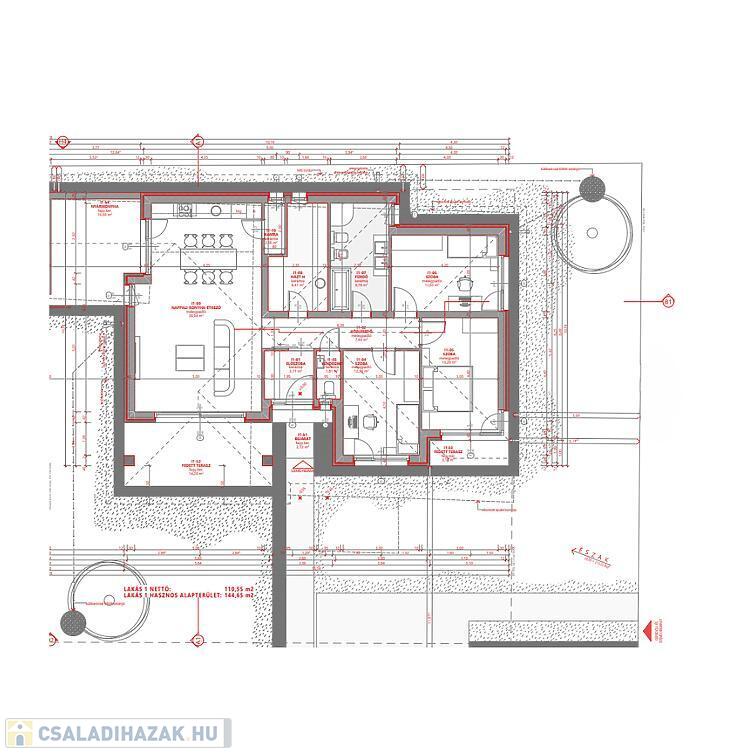 Amerikai konyhás nappali + étkező, 3 szoba, háztartási helyiség, fürdő + mellékhelyiség, előszoba, 2 db fedett terasz, nyárikonyha.