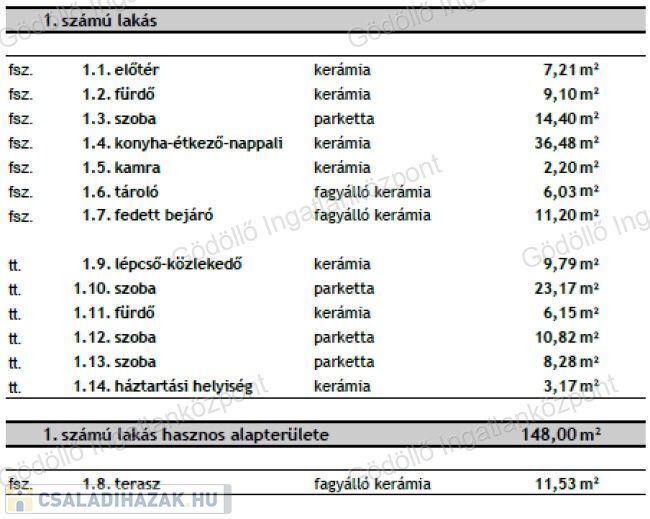 - Földszint: előtér, nappali-konyha-étkező, kamra, szoba, fürdő + 11,53nm terasz és 6,03nm tároló.