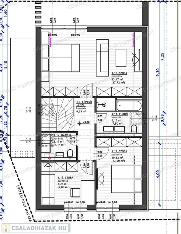 - Tetőtér: 3 szoba (az egyik kettéosztható), közlekedő, fürdő, háztartási helyiség.
