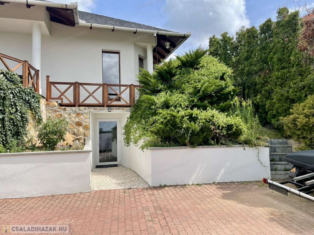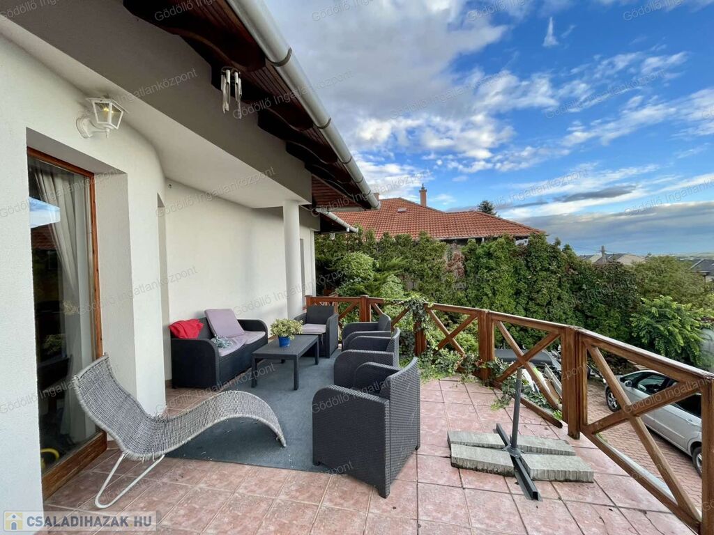 A kültéri rész igazán impozáns: fedett terasz és nagyobb erkély gondoskodik arról, hogy a panorámát és a kertet élvezni lehessen az év nagy részében is.