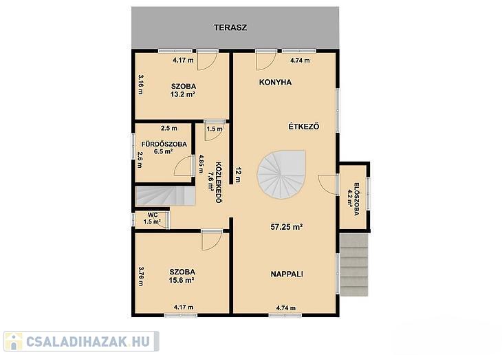 2 szoba, nappali + konyha + étkező, zuhanyzós/kádas fürdőszoba, mellékhelyiség, előszoba, közlekedő, nagyméretű terasz.