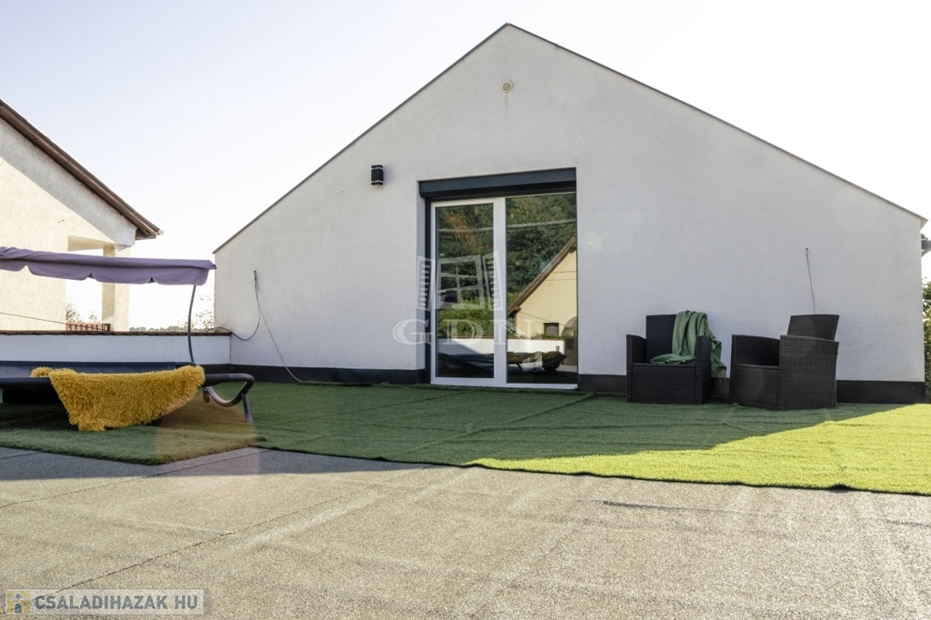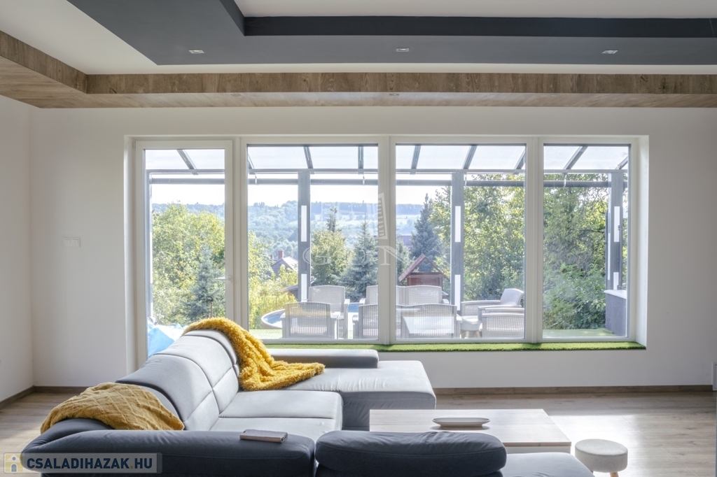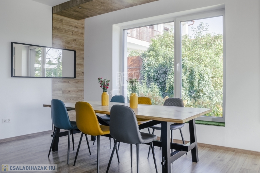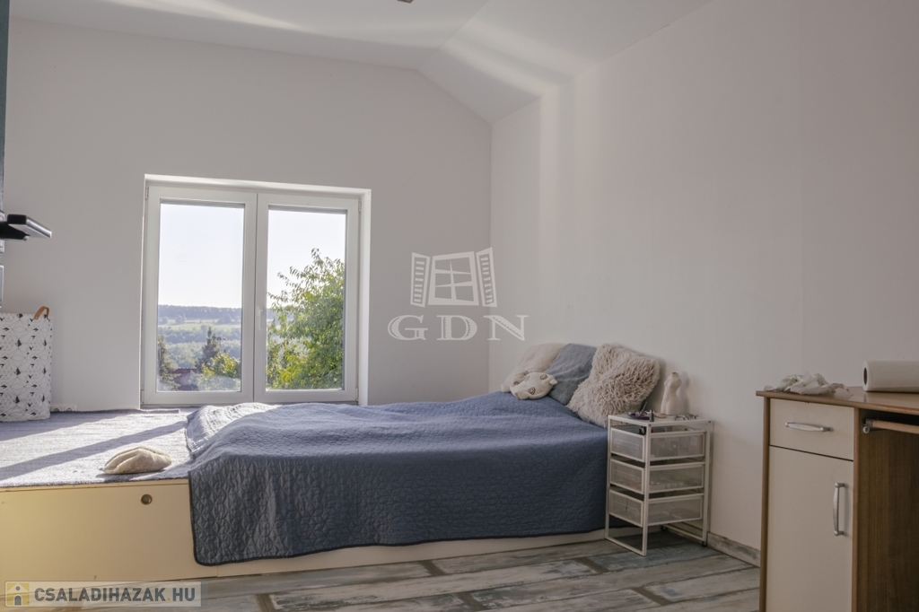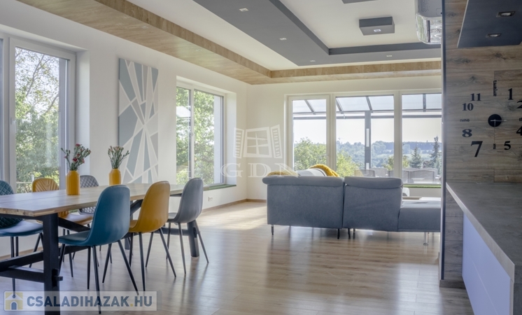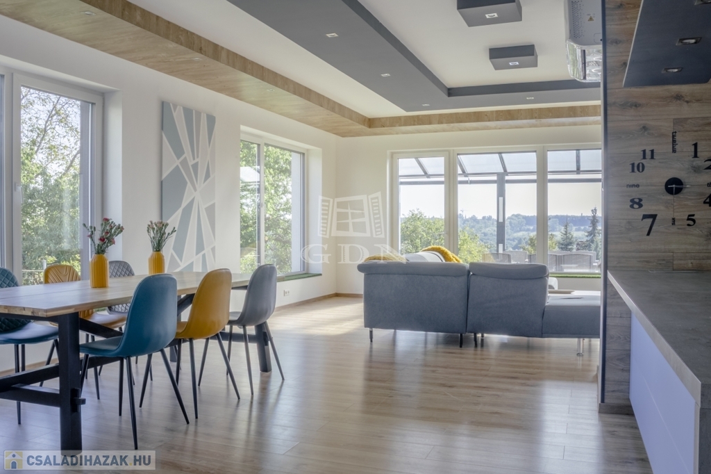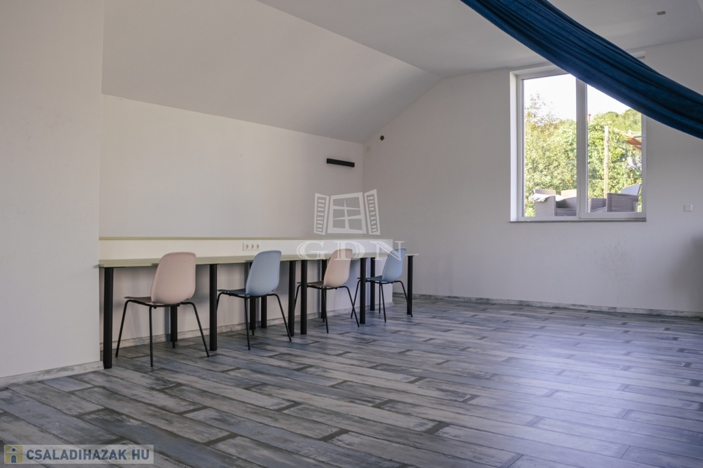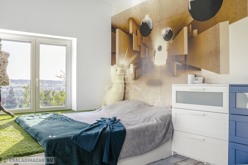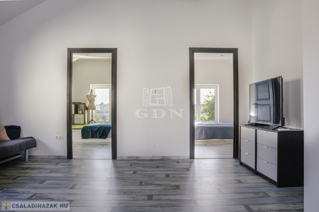 A ház jelenleg 5 szobás, a kialakítás lehetőséget ad további terek létrehozására – anélkül, hogy az összhatás sérülne.
