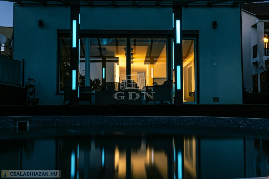 a merevfalú medence, a teraszos, burkolt kerti falak és a finoman megtervezett világítás egy olyan privát teret hoznak létre, amely nem hivalkodik, mégis egyértelműen prémium.