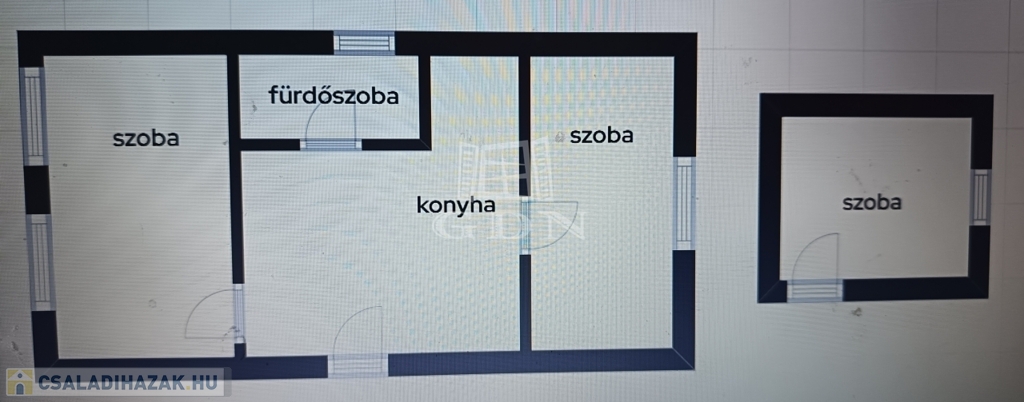 60 nm alapterületen konyha, szoba, előszoba, fürdőszoba, wc-vel.