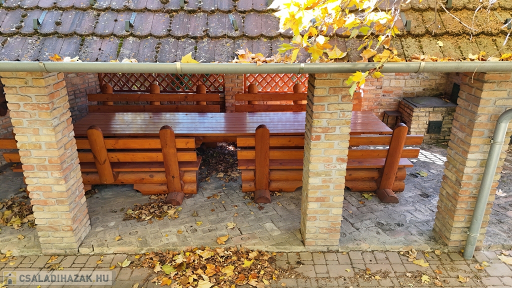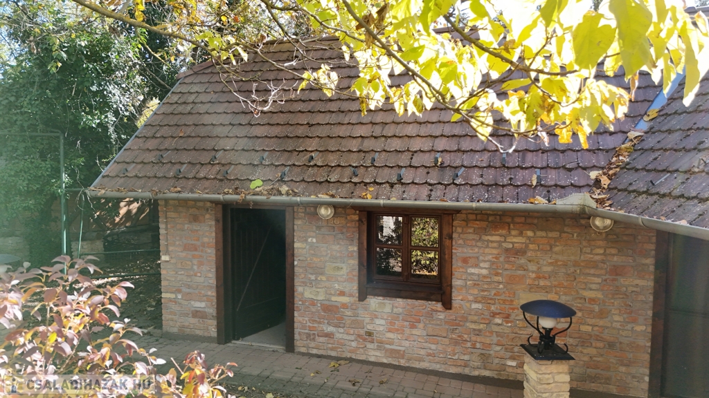 Az utcafrontról nézve bal oldalon található egy különálló, tágas, téglából épült garázsépület is. A teljes intimitást biztosító, kivételes méretű, parkosított kertben öntözőrendszer működik, a növényzetet rendszeresen ápolják a tulajdonosok. A telken nagy méretű fák biztosítják a nyári hónapokban a kellemes mikroklímát. A telek hátsó részében kapott helyet az egyedi kialakítású nyári konyha fedett étkezővel, mely adottságainál fogva akár nagy létszámú összejövetelek hangulatos helyszíne is lehet. Mellette sokféleképpen hasznosítható, téglából épült műhely található. A főépület pincéjében téglával kirakott, bájos borospince található.