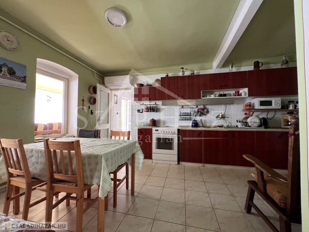 A hátsó részben egy nagy étkező-konyha, spájz, szoba, fürdőszobával.