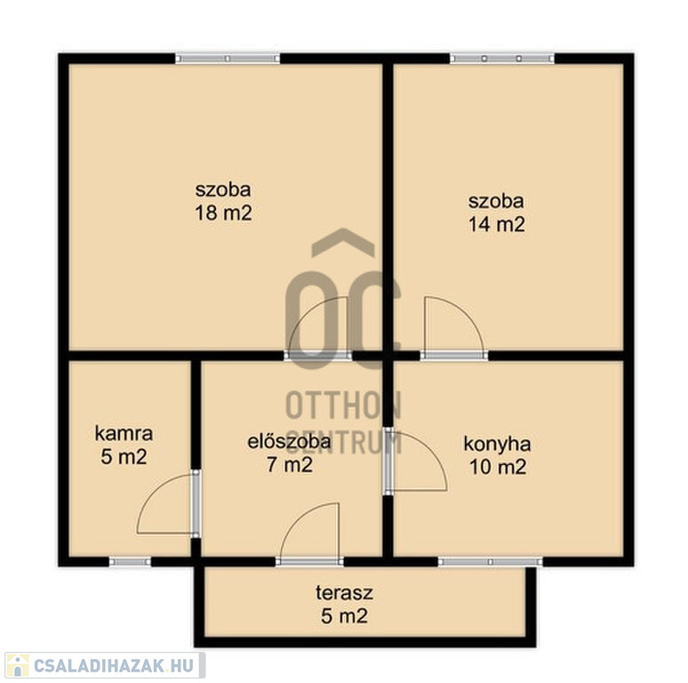 Elosztása két szoba, konyha, előszoba, kamra és egy napfényes terasz.