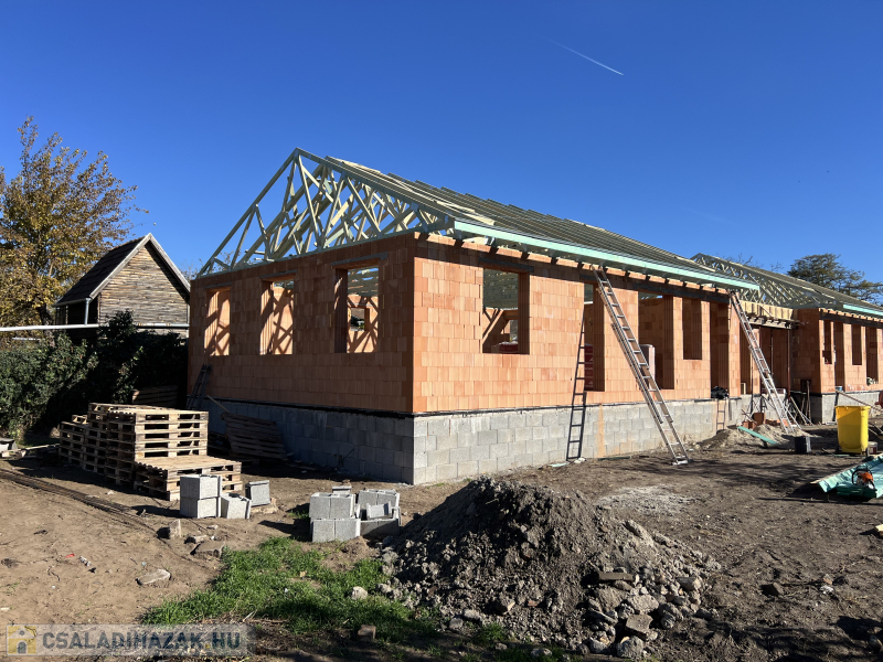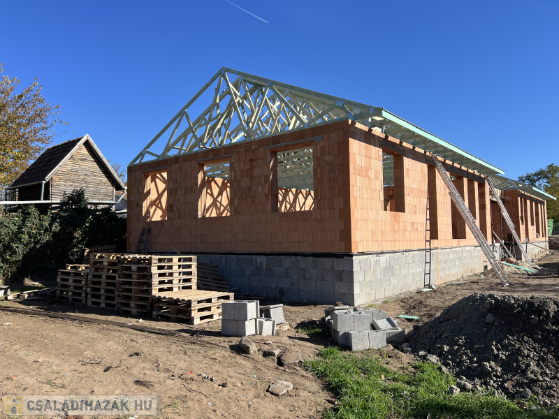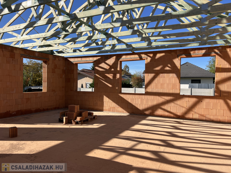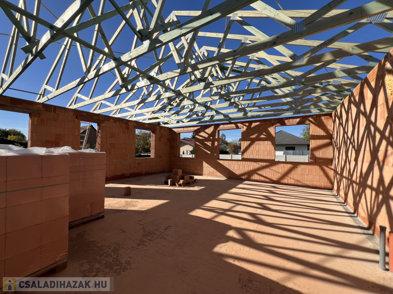 Vasbeton sávalap, Rapid X-Therm PTH 30CM tégla főfalak 20 cm-es dryvit hőszigeteléssel. Műanyag homlokzati nyílászárók 3 rétegű üveggel. Beton födém 20 cm ásványszálas hőszigeteléssel. Fűtés és meleg víz hőszivattyúról, mindenhol padlófűtés . Antracit beton cserép héjazás. Festés, burkolás, szaniterek, belső ajtók választhatók. A hideg burkolatok 7000 Ft./m2 árig , meleg burkolatokat 4500 Ft./m2 árig, a belső ajtókat 50.000 Ft./db. árig tartalmazza a vételár. Riasztó vezetékelve, klíma becsövezése, rejtett redőnytok kialakítás,alumínium redőnyök fehér színben, elektromos kiállások a redőnynek , elektromos kiállás a kapuknál. H tarifa kiépítve, kocsibeálló viacolor (10x20-as) szürke, kiskaputól bejáratig Viacolor (10x20-as) szürke, a ház körül 40 cm széles védőjárda szegélykőből, közé apró kaviccsal betöltve.