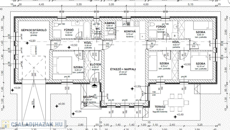 Vasbeton sávalap, 30 cm-es Porotherm tégla főfalak 12 cm-es dryvit hőszigeteléssel. Műanyag homlokzati nyílászárók 3 rétegű üveggel. Fa födém 30 cm. kőzetgyapot hőszigeteléssel. Bramac cserép héjalás. Festés, burkolás, szaniterek, belső ajtók választhatók. A hideg, meleg burkolatokat 6000 Ft./m2 árig, a belső ajtókat 75000 Ft./db. árig tartalmazza a vételár. Mosdó csaptelep: 25 ezer Ft., mosdó: 25. ezer Ft., Kádtöltő csaptelep: 40 ezer Ft., Fürdőkád: 100 ezer Ft., Zuhany csaptelep szett: 40 ezer Ft. Zuhanykabin épített zuhanyhoz: 200 ezer Ft., WC csésze: 25 ezer Ft. (beépített tartályos wc-k kerülnek kialakításra)