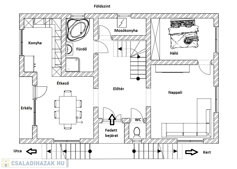 - földszint: hatalmas előszoba, elszeperált konyha – étkező, nappali, szülői háló, WC, mosókonyha, és egy nagyméretű fürdőszoba káddal és zuhanyzóval