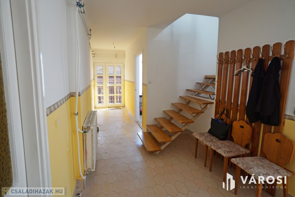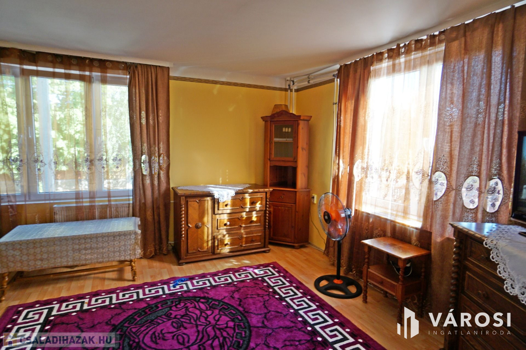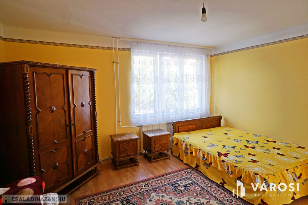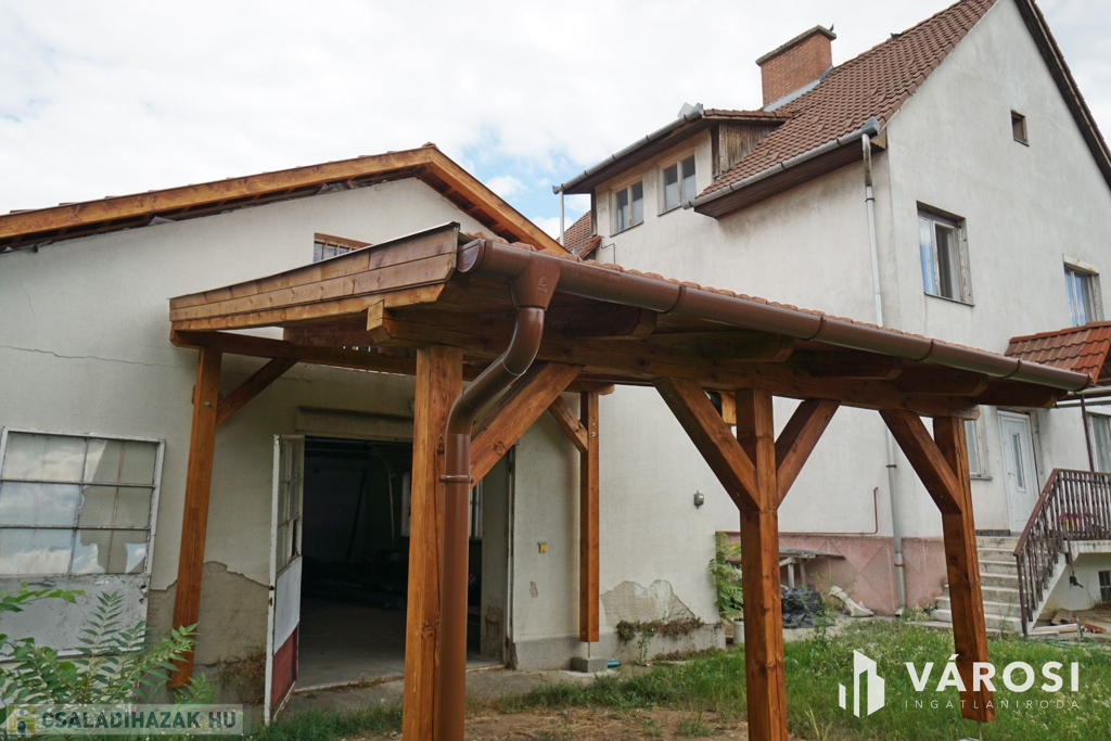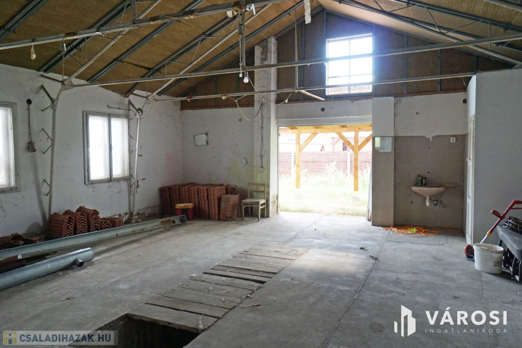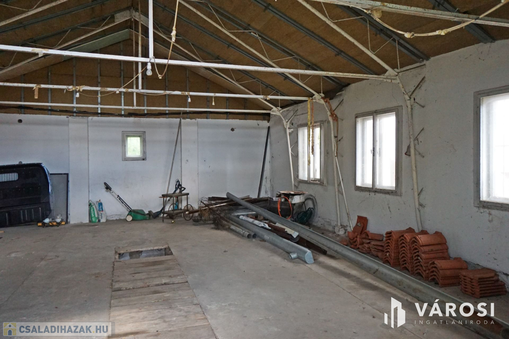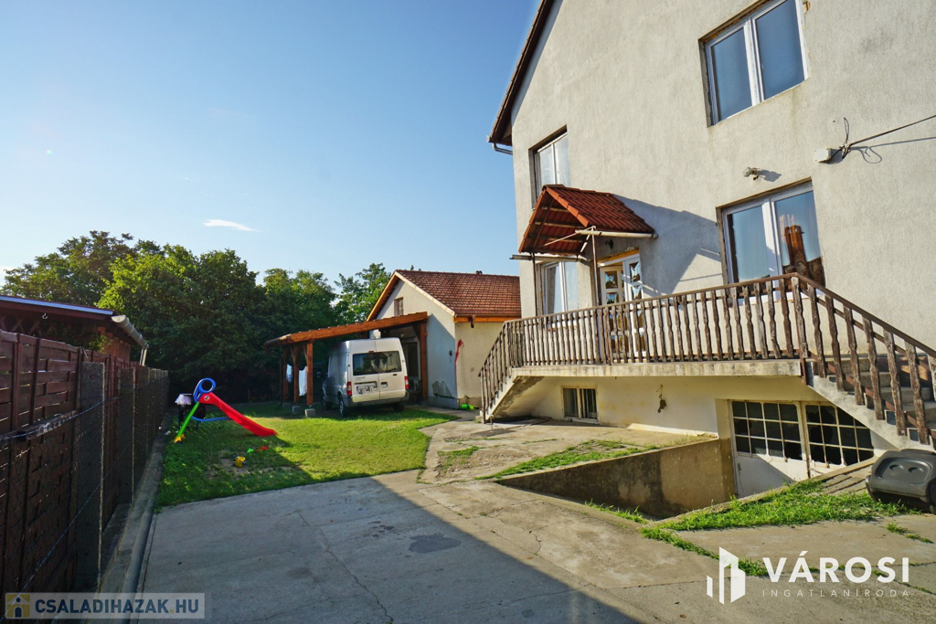 160 m2-es családi ház, 70 m2 pincével, 60 m2-es melléképülettel.