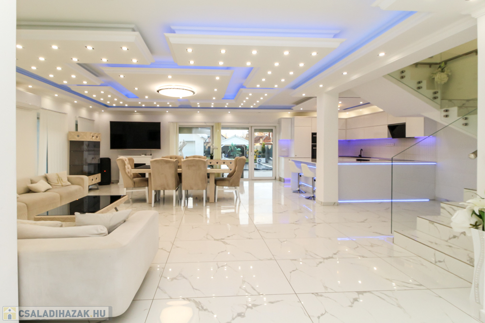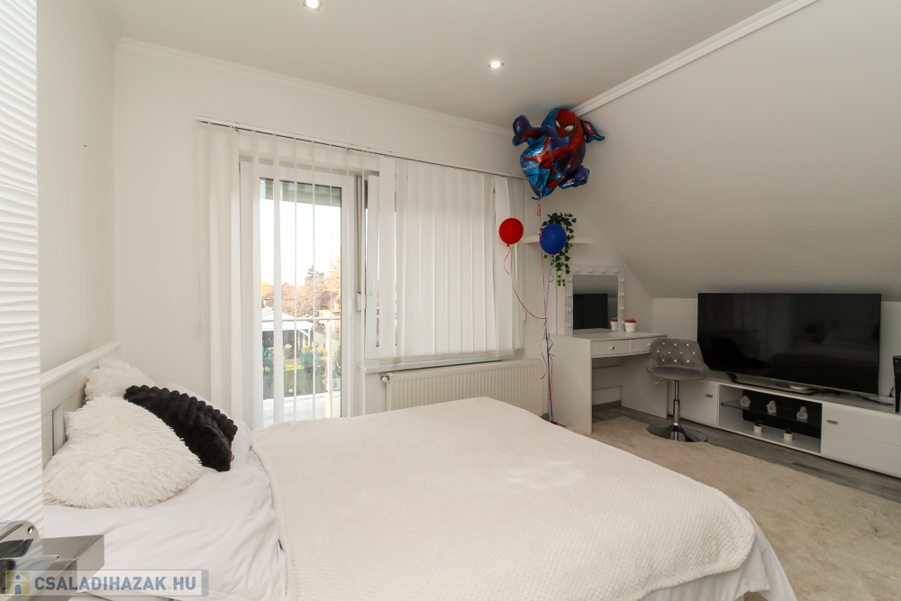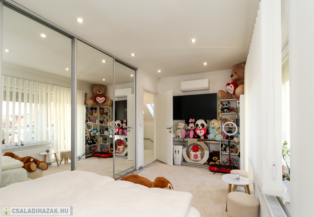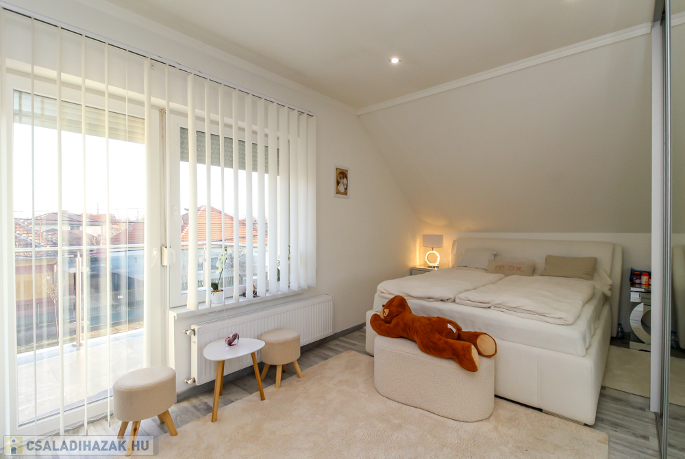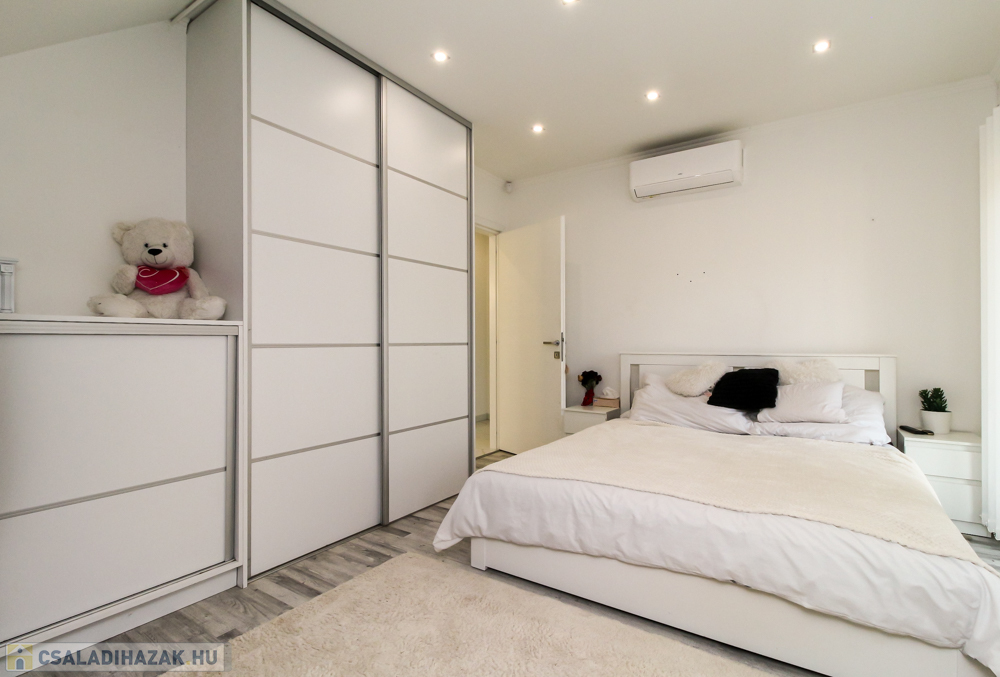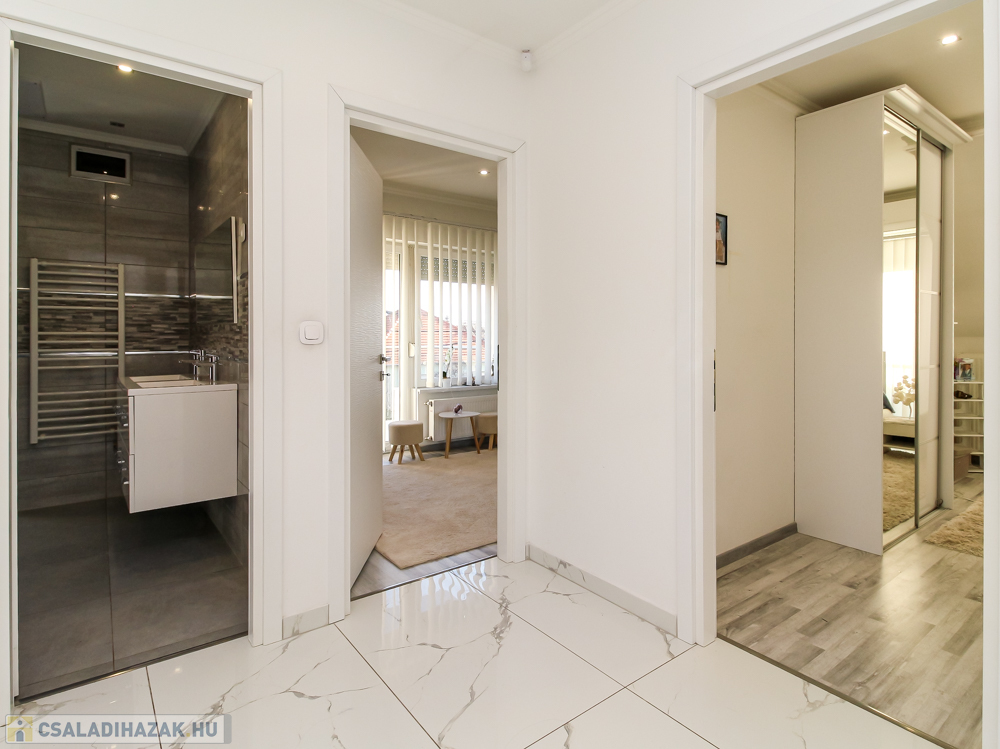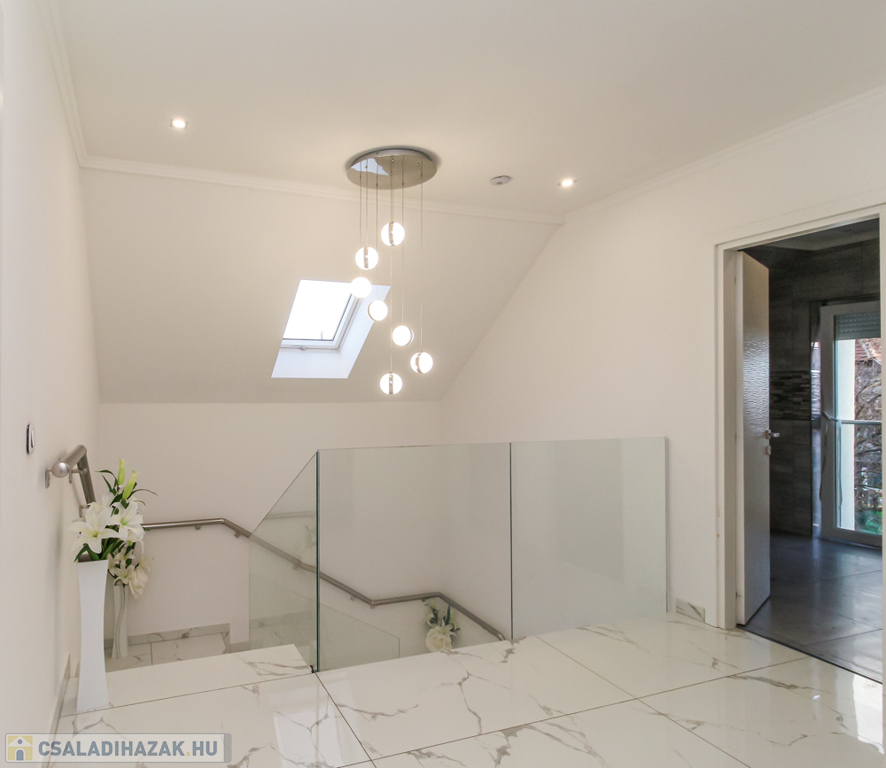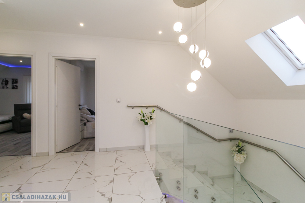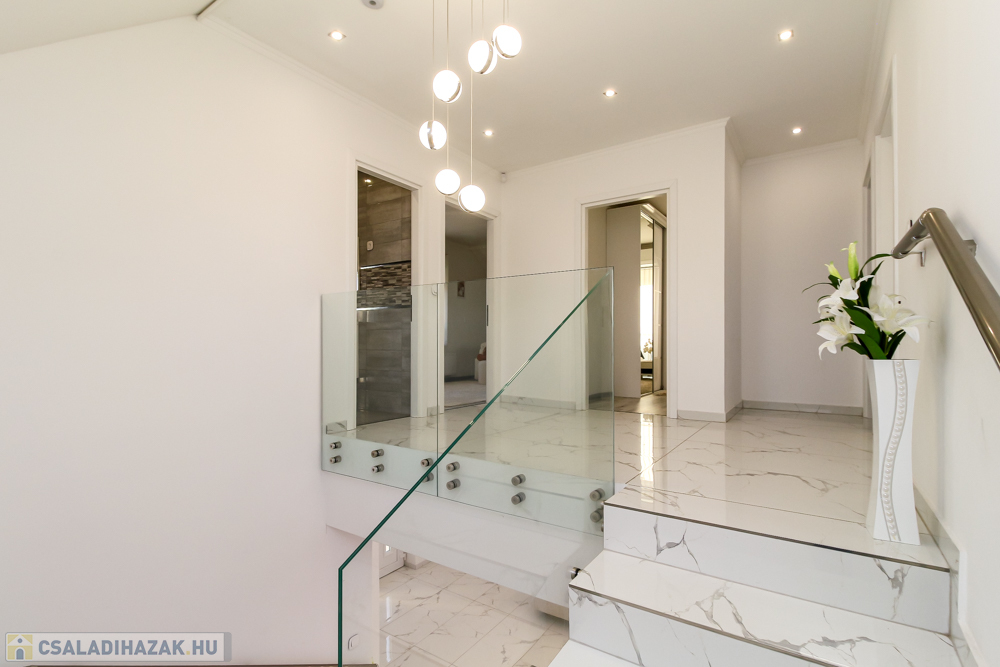 A sík telken fekvő családi ház kiemelkedik a kertváros többi ingatlanai közül külső megjelenésében, mégis visszafogott, nem hivalkodó. A bejárati ajtón belépve a 60 nm-es impozáns nyitott konyha nappali együttese tárul elénk, ami a belső nettó 172 nm-es kétszintes ház központja és kapcsolódik hozzá egy 17 nm kertre néző terasz.