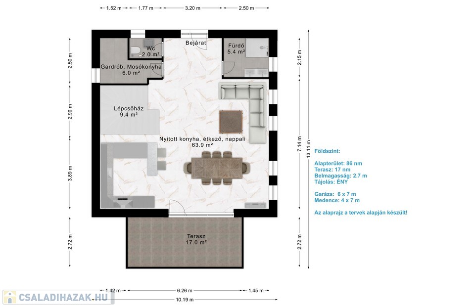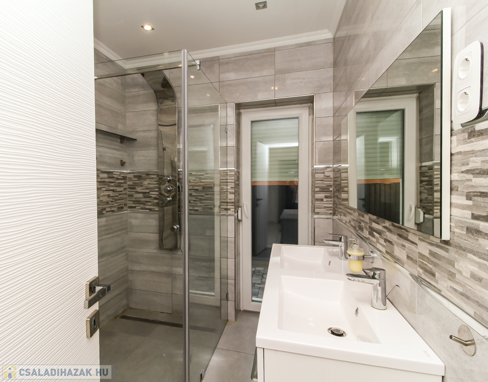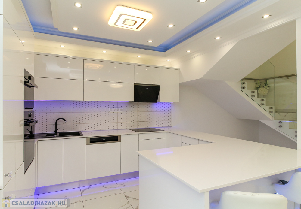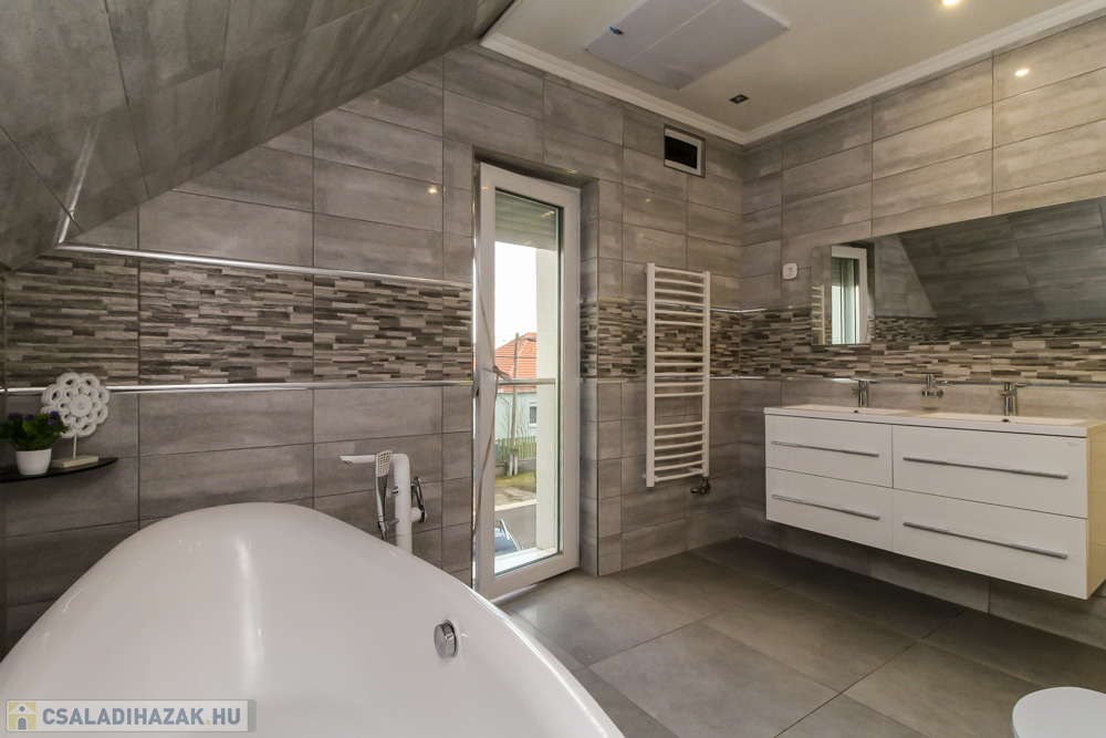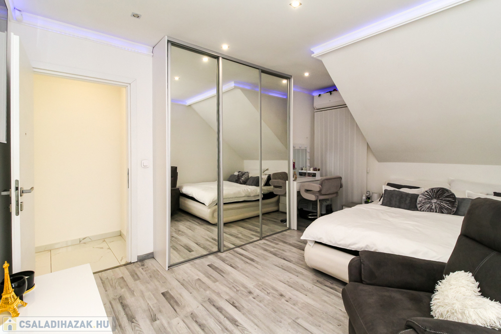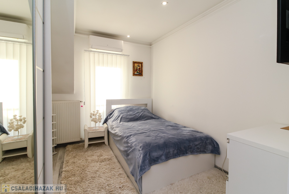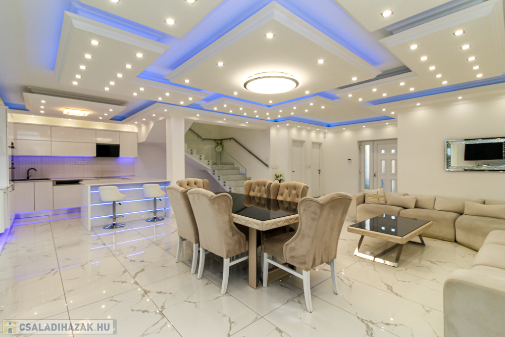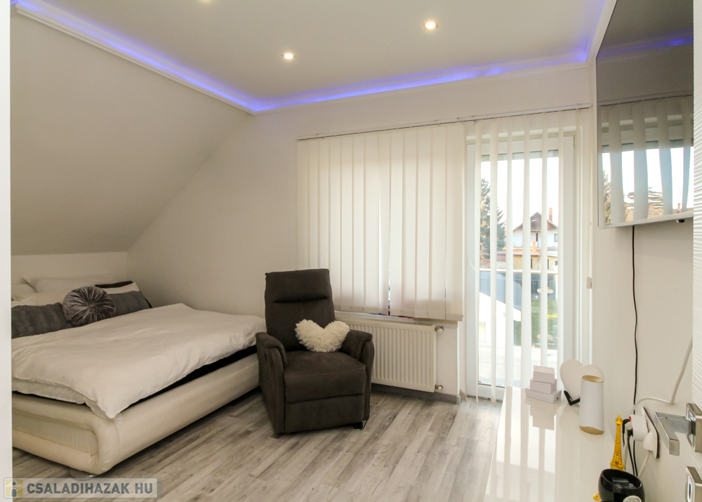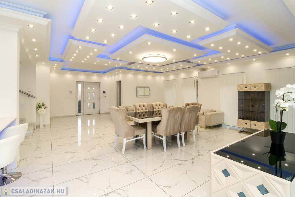 A sík telken fekvő családi ház kiemelkedik a kertváros többi ingatlanai közül külső megjelenésében, mégis visszafogott, nem hivalkodó. A bejárati ajtón belépve a 60 nm-es impozáns nyitott konyha nappali együttese tárul elénk, ami a belső nettó 172 nm-es kétszintes ház központja és kapcsolódik hozzá egy 17 nm kertre néző terasz.
