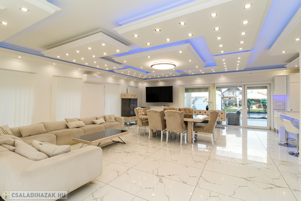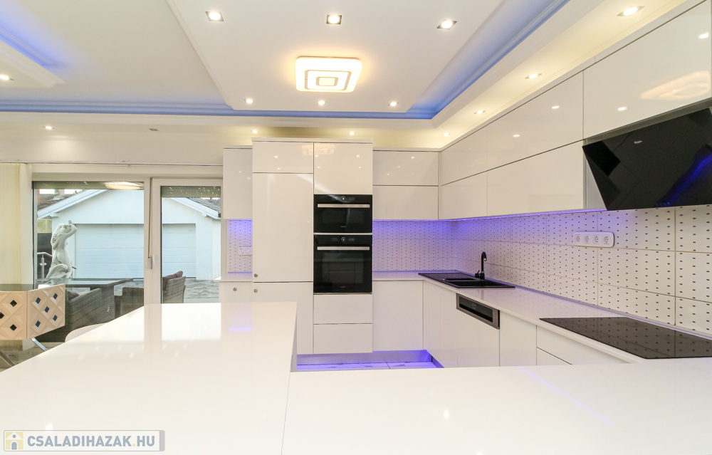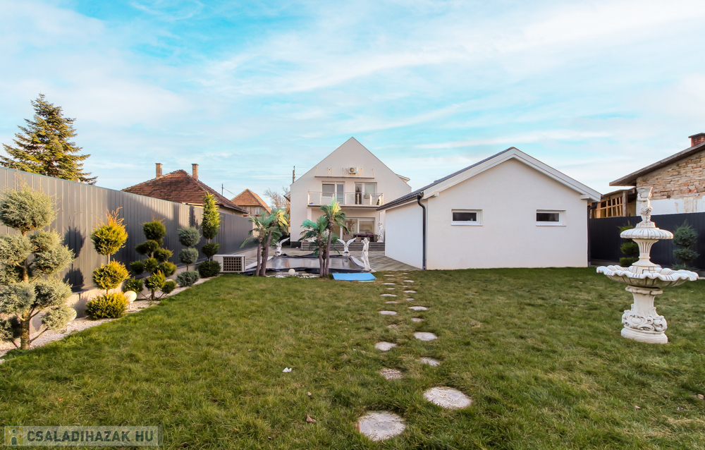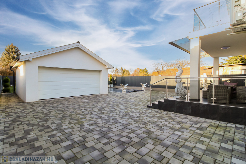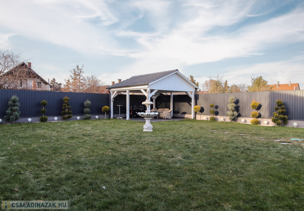Kertje az otthoni kikapcsolódást maximálisan kiszolgálja. Dísznövényekkel tarkított és dekorvilágítással felszerelt, az automata öntözőrendszer wifi-ről vezérelhető. A 4 x 7 méteres medence természetesen fűthető, a 25 nm-es filagória alkalmas grillezésre, családi összejövetelek megtartására. A 42 nm-es fűthető garázsban 2 autó kényelmesen elfér.