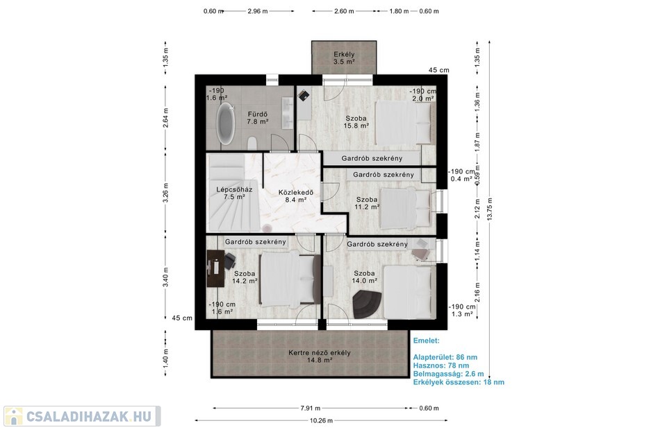 Tartószerkezet: 30 cm vastag Porotherm téglafalazat, 15 cm AT-H80 THR hőszigetelő rendszer.