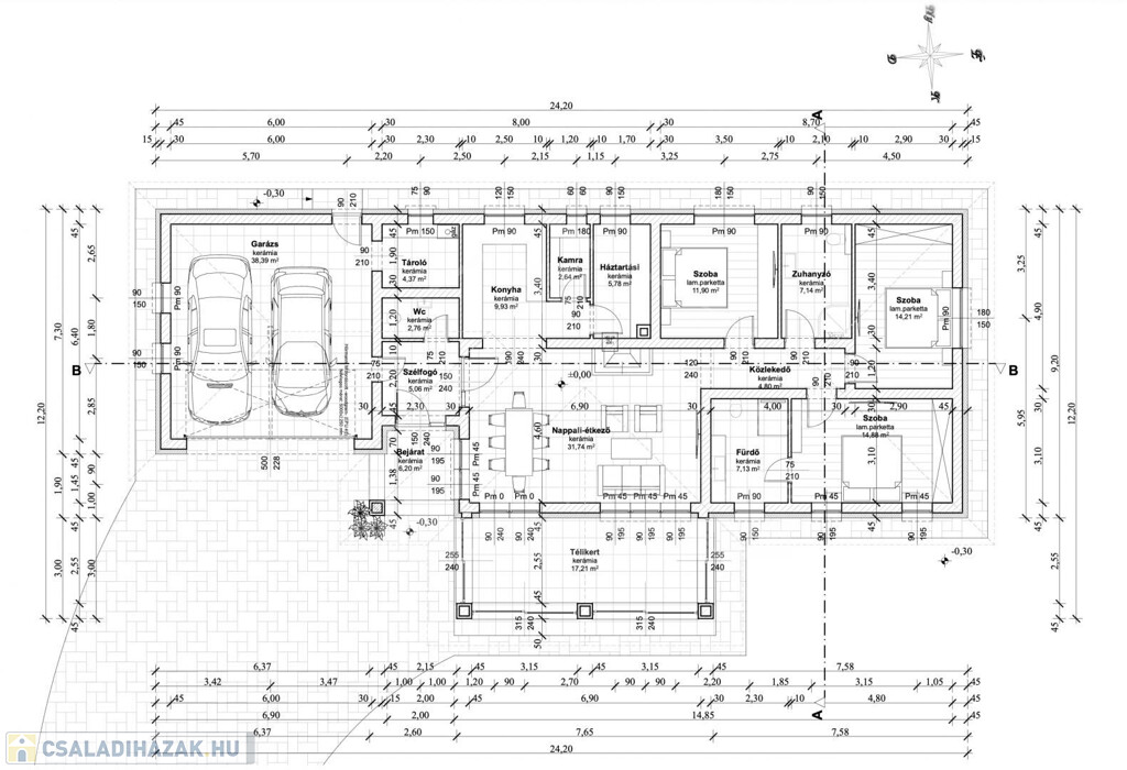 A dupla garázs nemcsak két gépjármű számára kínál kényelmes parkolást, hanem kapcsolódik hozzá egy külön kazánház, ami egyben tároló helyiség is, amely tovább növeli az ingatlan funkcionalitását.