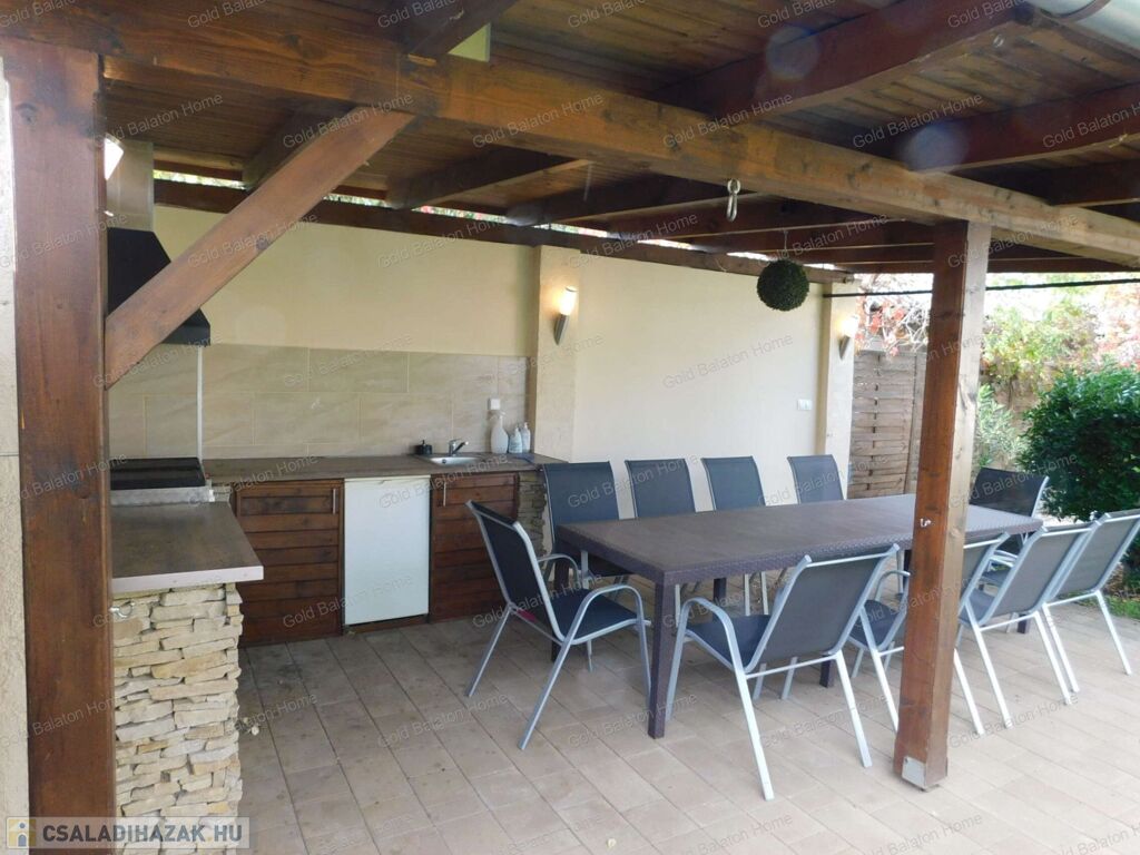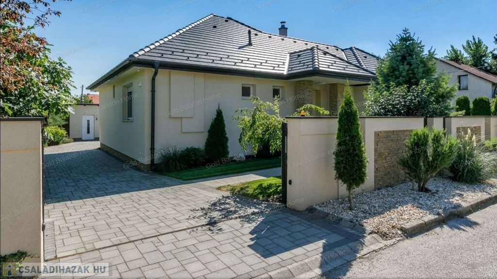 Egyszintes, újszerű CSALÁDI HÁZ 1 nagy nappalival, 4 hálószobával, 2 fürdőszobával, nagy terasszal, játszótérrel, kerti grill konyhával, garázzsal, szép, parkosított udvarral, csendes helyen, a strandtól mindössze 1000 méterre eladó.