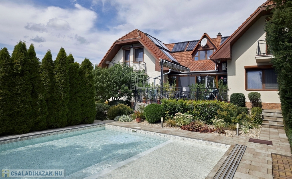 Kertben öntöző rendszer telepített, örökzöld növényekkel parkosított, melyben egy fedett, fűthető úszómedence található.