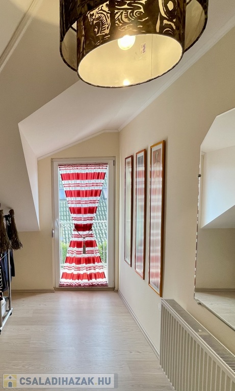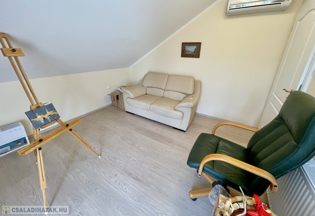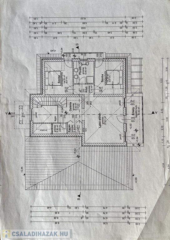 a lépcsőházból feljutva a második szinten: Galéria 8,35 (7,53) m2, kazán 2,30 (1,28) m2, gardrób 5,32 (2,65) m2, lakó előtér (nappali) 27,61 m2, erkély 11,92 m2, szoba 14,26 (8,07) m2, fürdőszoba + WC 6,90 m2, szoba 14,26 (8,07) m2, közlekedő 3,15 m2, erkély 4 m2 lett kialakítva.