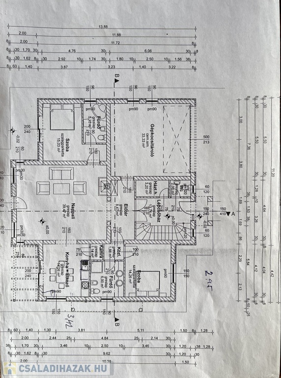 Az alsó szinten: Garázs 33,33 m2, előtér 8,47 m2, nappali 39,47 m2, szoba 15,03 m2, fürdőszoba + WC 5,15 m2, szoba 14,26 m2, fürdőszoba + WC 6,90 m2, konyha + étkező 14,26 m2, kamra 1,14 m2, terasz 10,0 m2, közlekedő 1,88 m2, háztartási helyiség 3,20 m2, WC 2,0 m2, lépcsőház 13,74 m2 található,