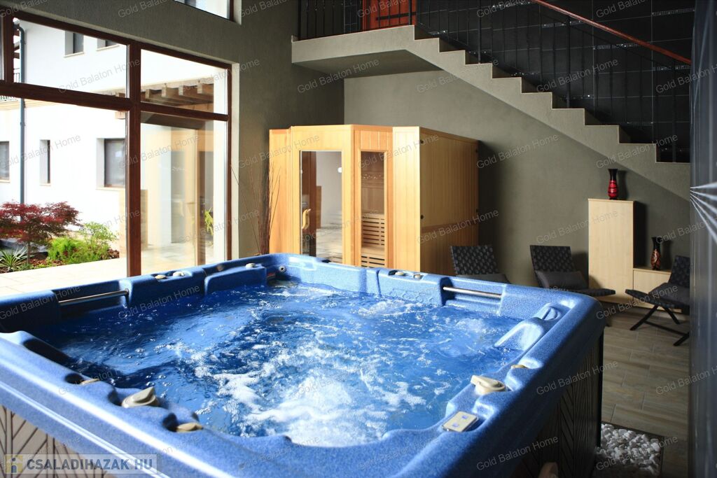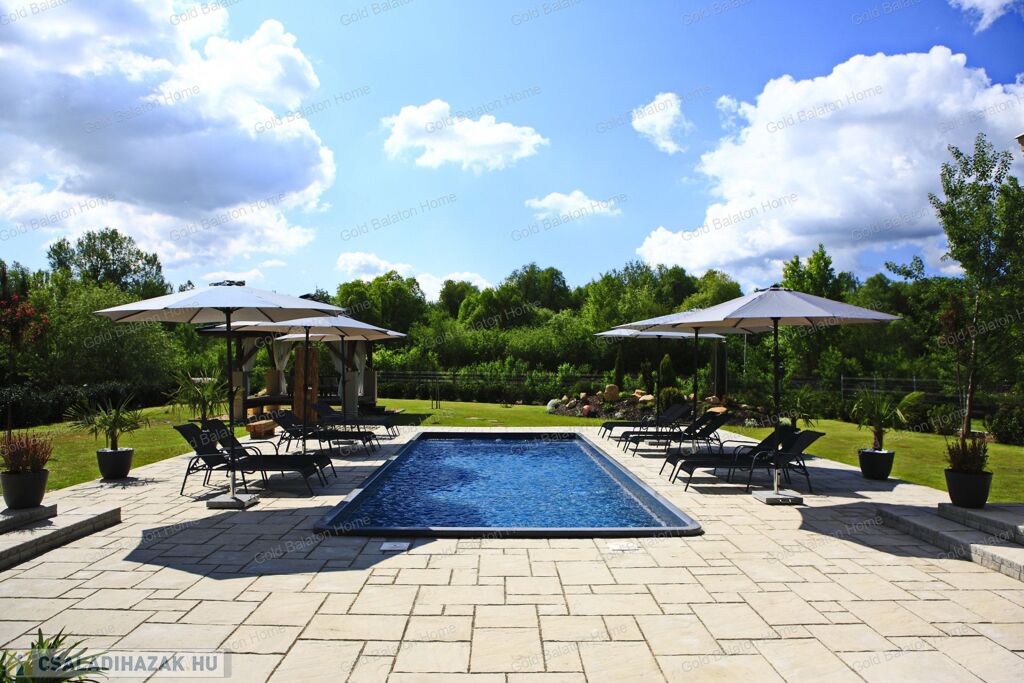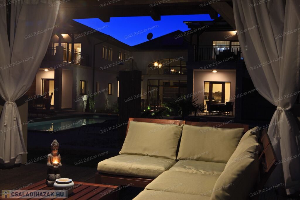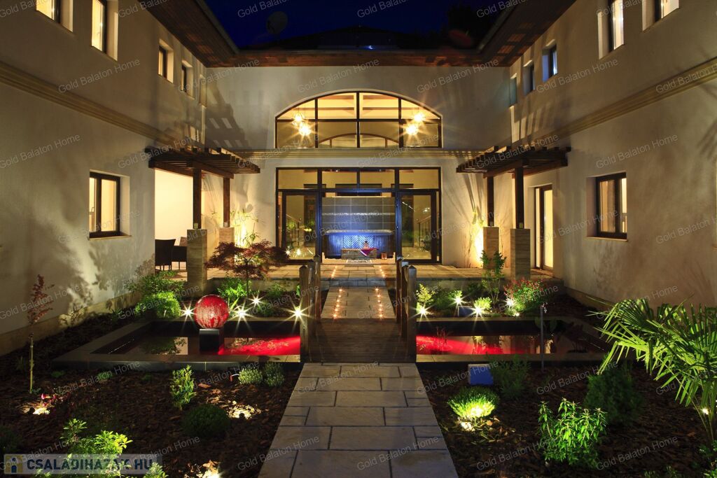 Minőségi anyagokból épült ház, mely külső medencével, belső wellness részleggel kínál testi, lelki felüdülést. A villa kertjét különleges növények kompozíciója, kis kerti tó, esti világítás ékesíti.