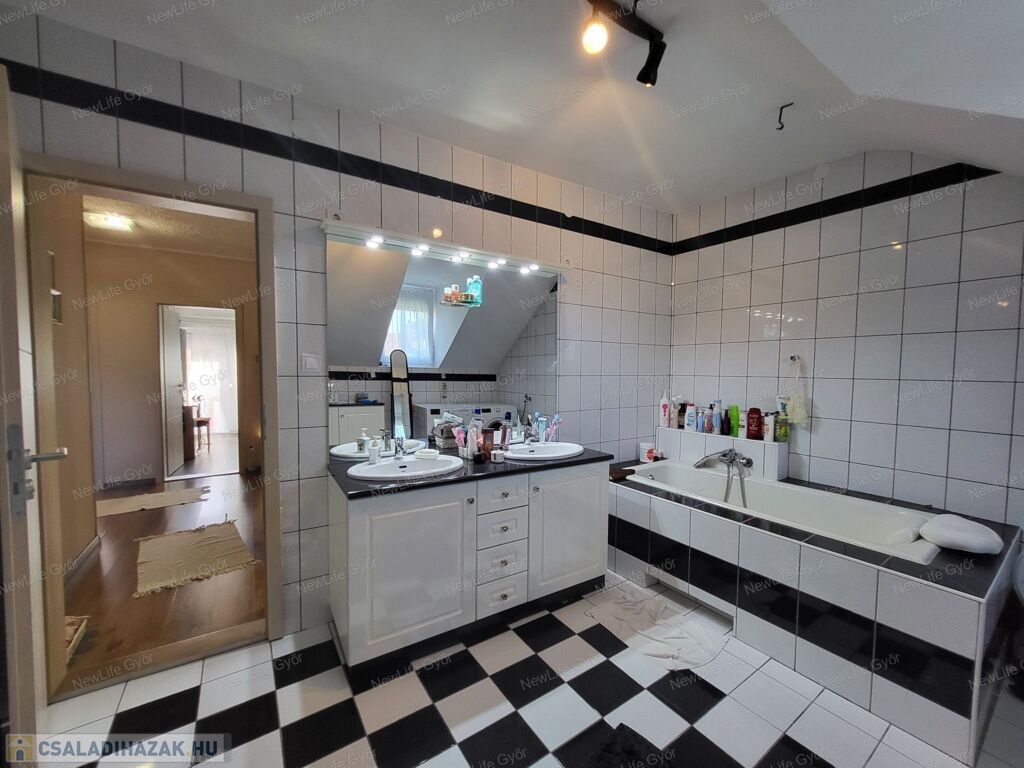- Két fürdőszoba – az alsó zuhanyzós, a felső kádas, dupla mosdóval