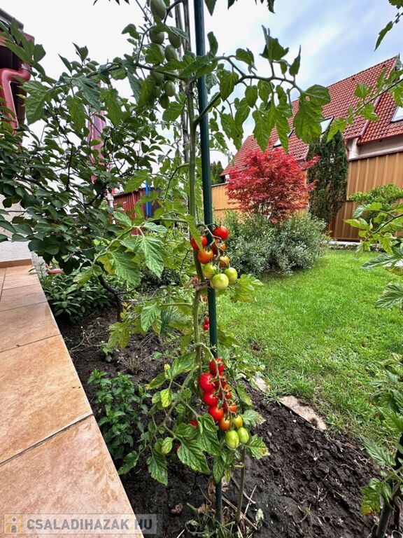 A 15 m²-es félig fedett terasz tökéletes helyszín egy nyári reggelihez vagy egy nagy családi vacsorához alkonyatkor. Innen nyílik a kb. 70 m²-es, automata öntözőrendszerrel ellátott hobbikert, amely valódi kis ékszerdoboz: dísznövények, illatos fűszernövények, zamatos paradicsomágyások teszik otthonossá és hasznossá a kertet. A természet és a szépség szeretete mindenütt jelen van.